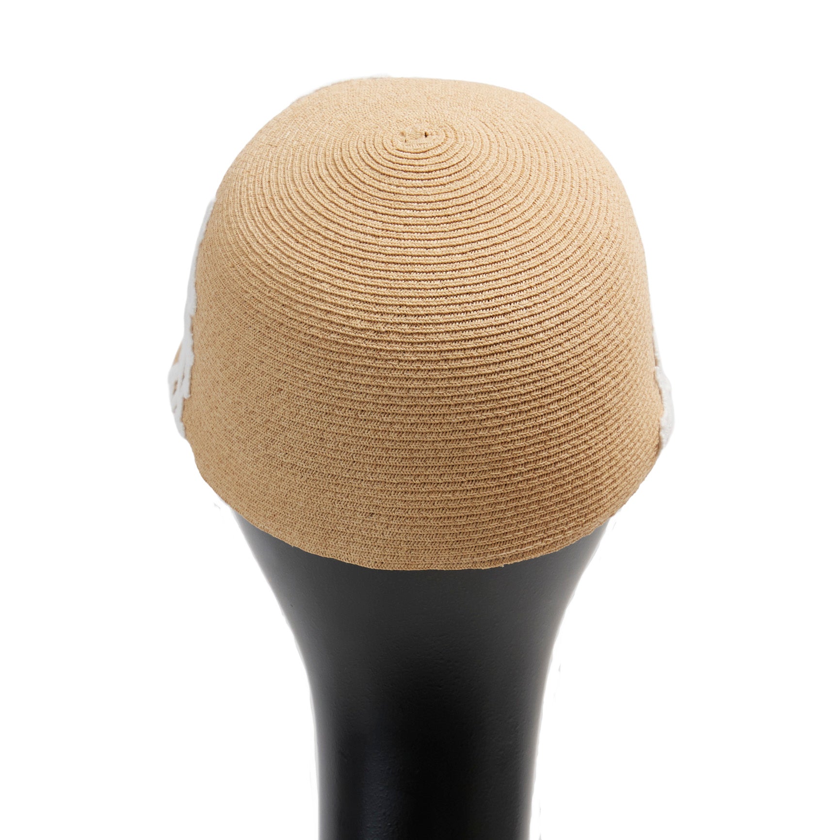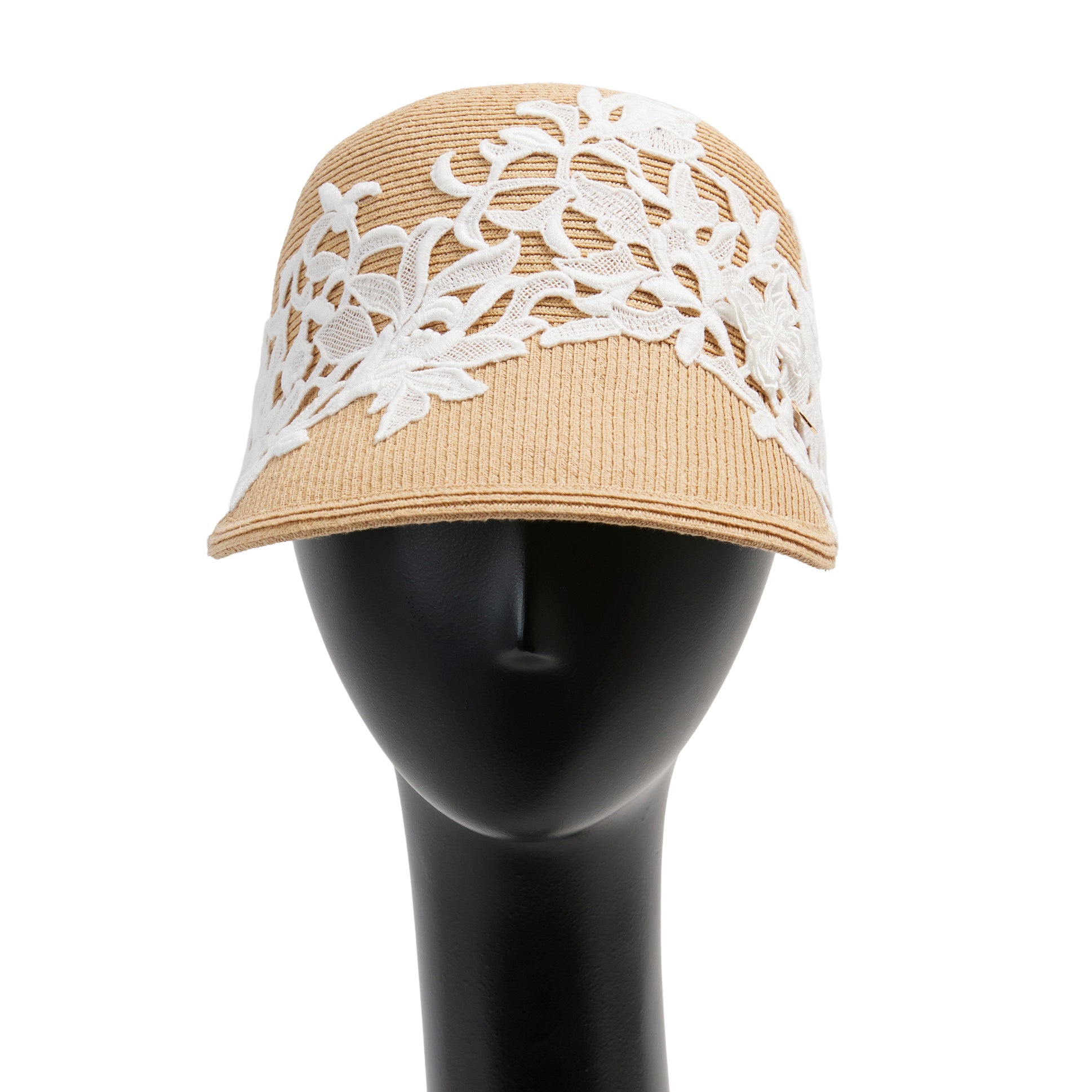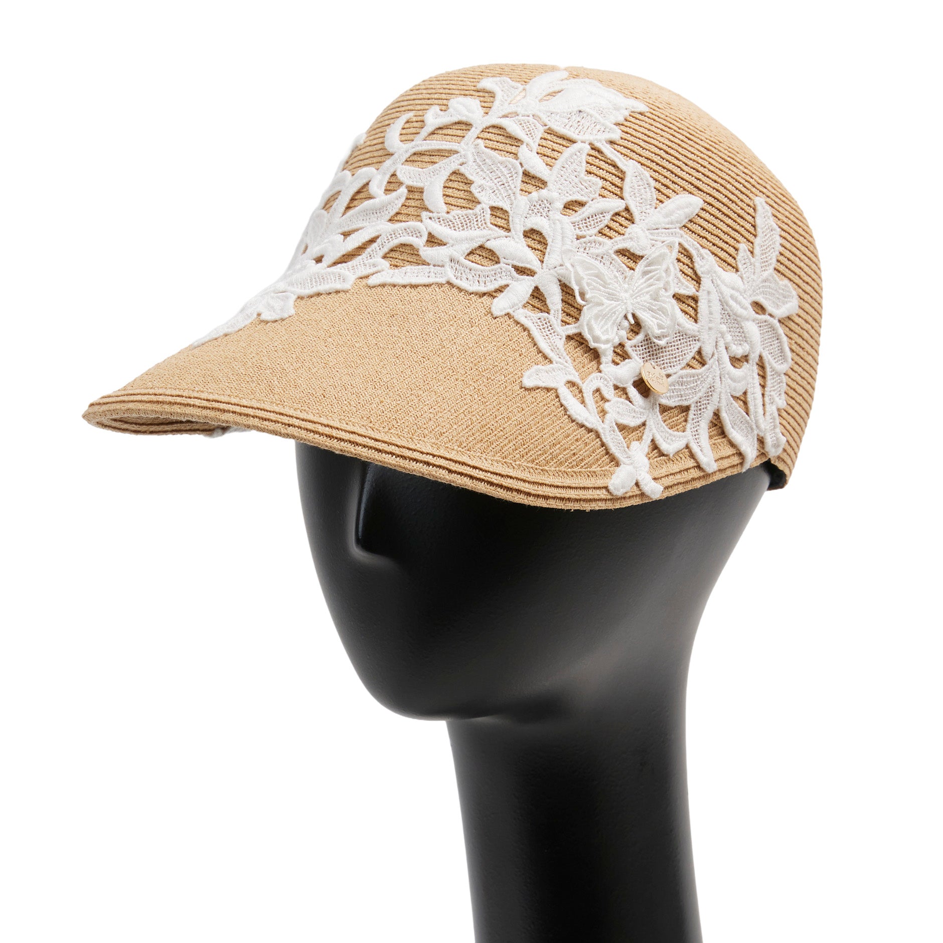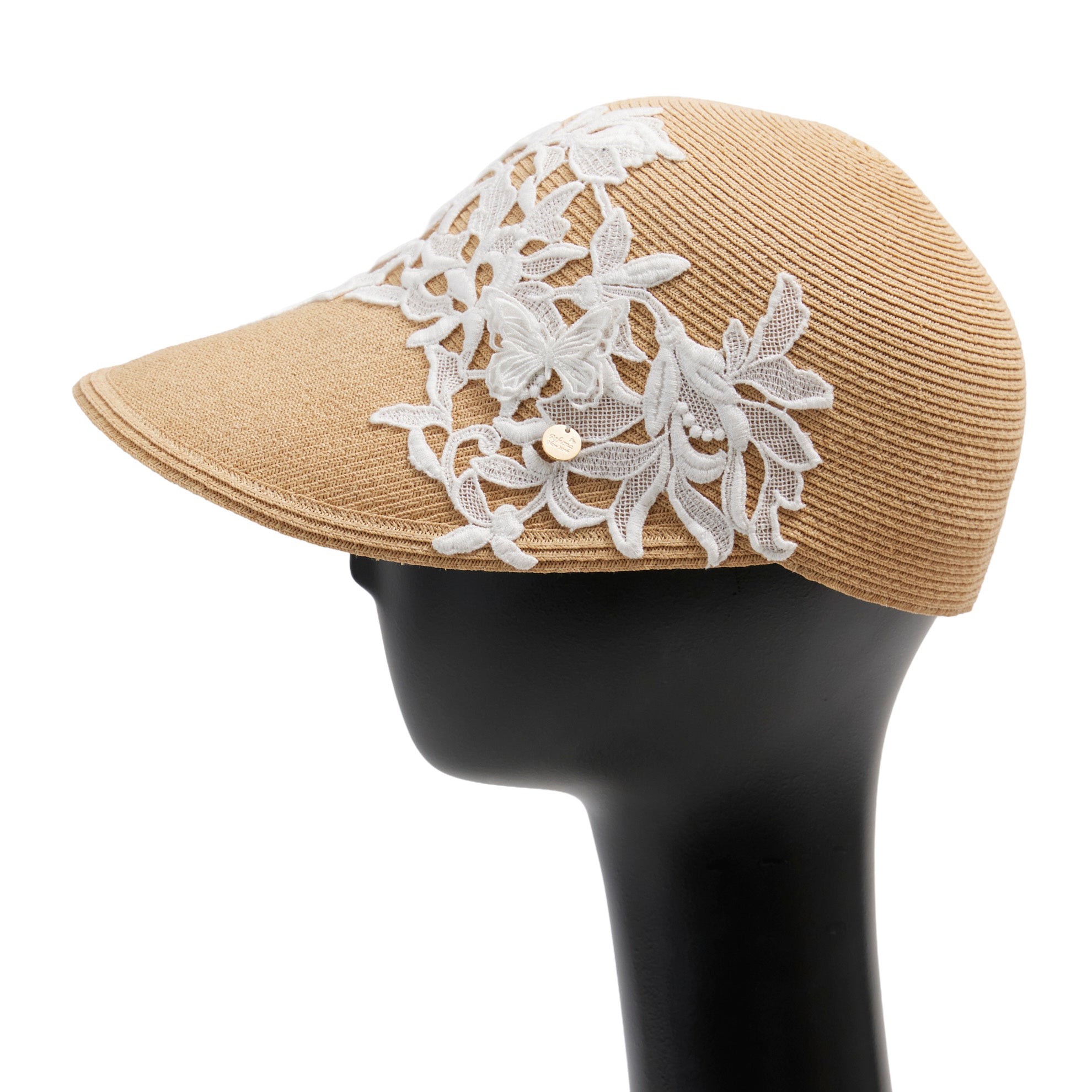 ここ数年人気が続いているキャップ型の帽子帽体に、アールヌーボー調の蔦やお花をモチーフにしたレースを大胆に前頭面にあしらい、その上に蝶々のレースをのせて、カジュアルなキャップ型の帽子をラグジュアリーテイストに仕上げています。