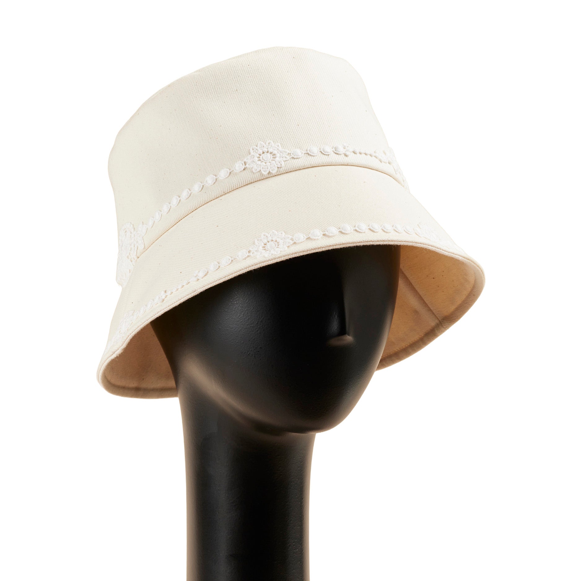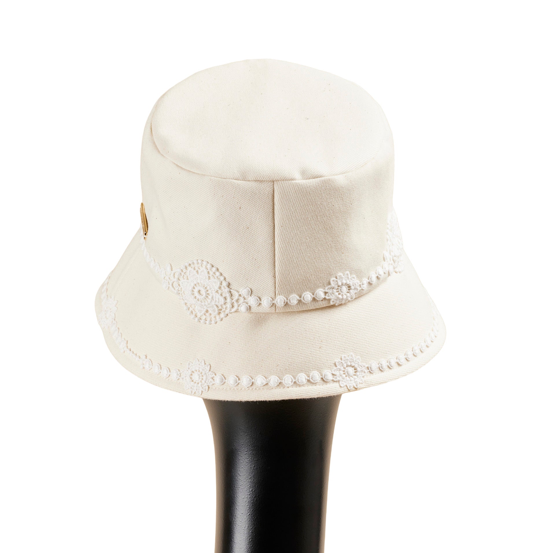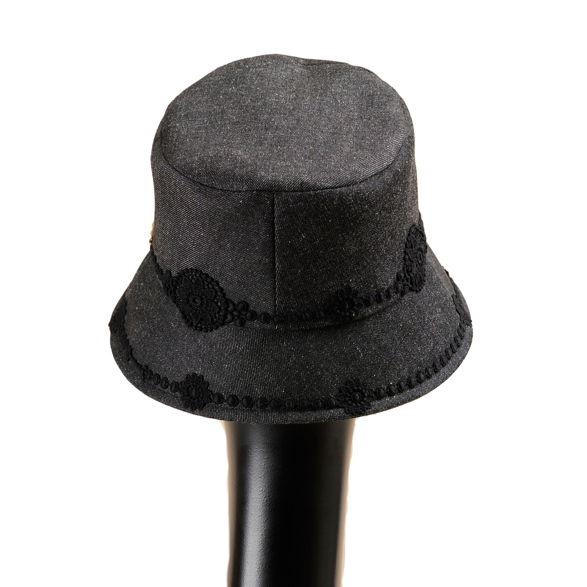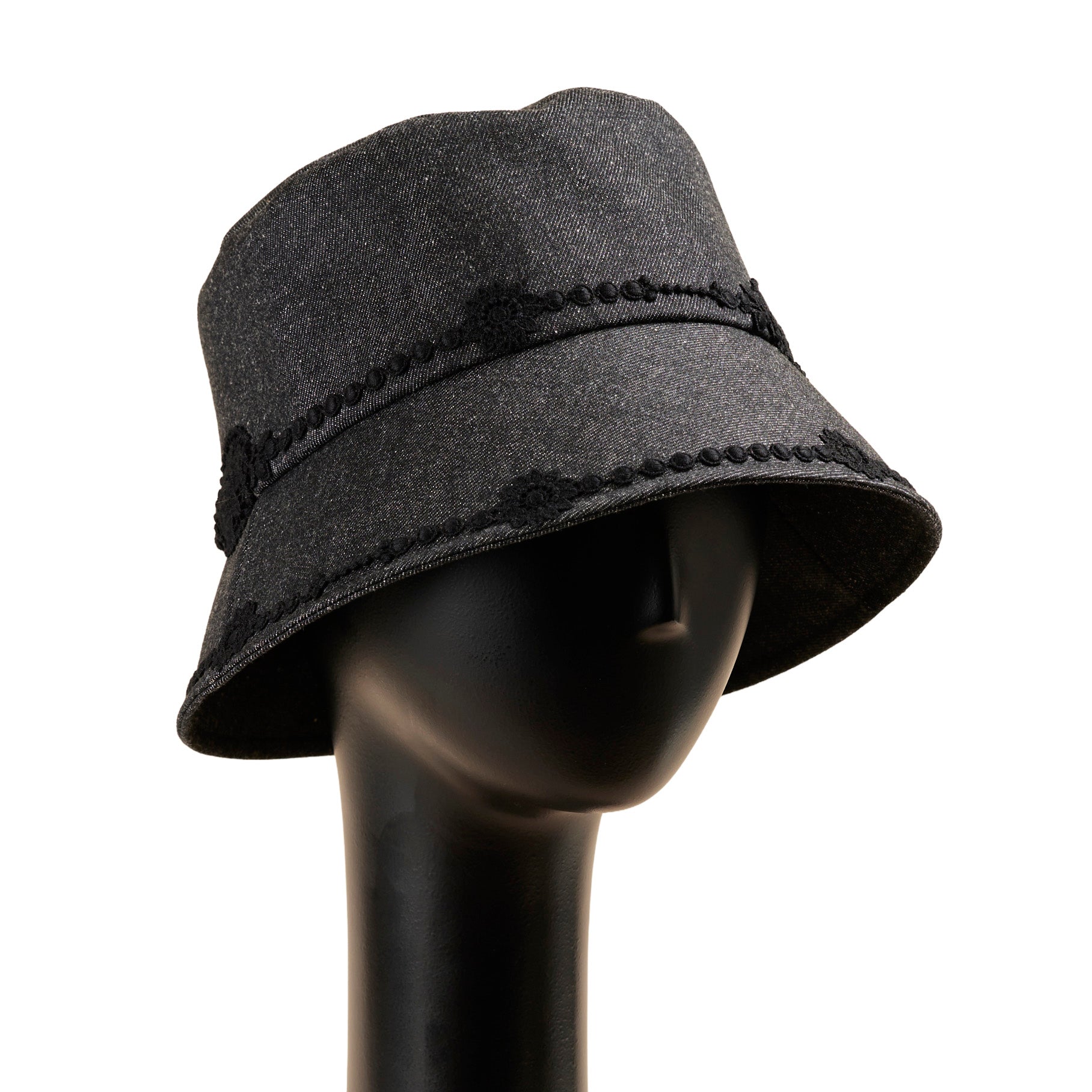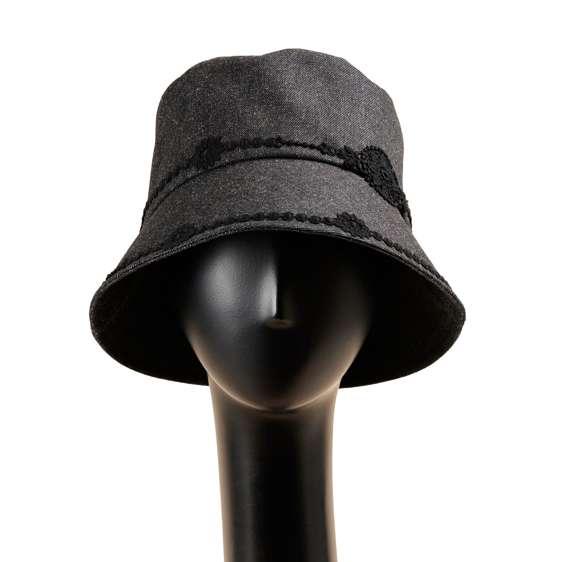 岡山県産のデニム生地を使って製作した、ここ数年とても人気なバケット型の帽子本体に、繊細なデザインのレースをブリムのフチと頭回りの2段にあしらった、大人フェミニンで可憐なデザインに。帽子本体と装飾が同系色なので、落ち着いた雰囲気に仕上がっています。デニムのカジュアル感をブラックとキナリ色を使う事で、大人で上品なカジュアルさを演出。