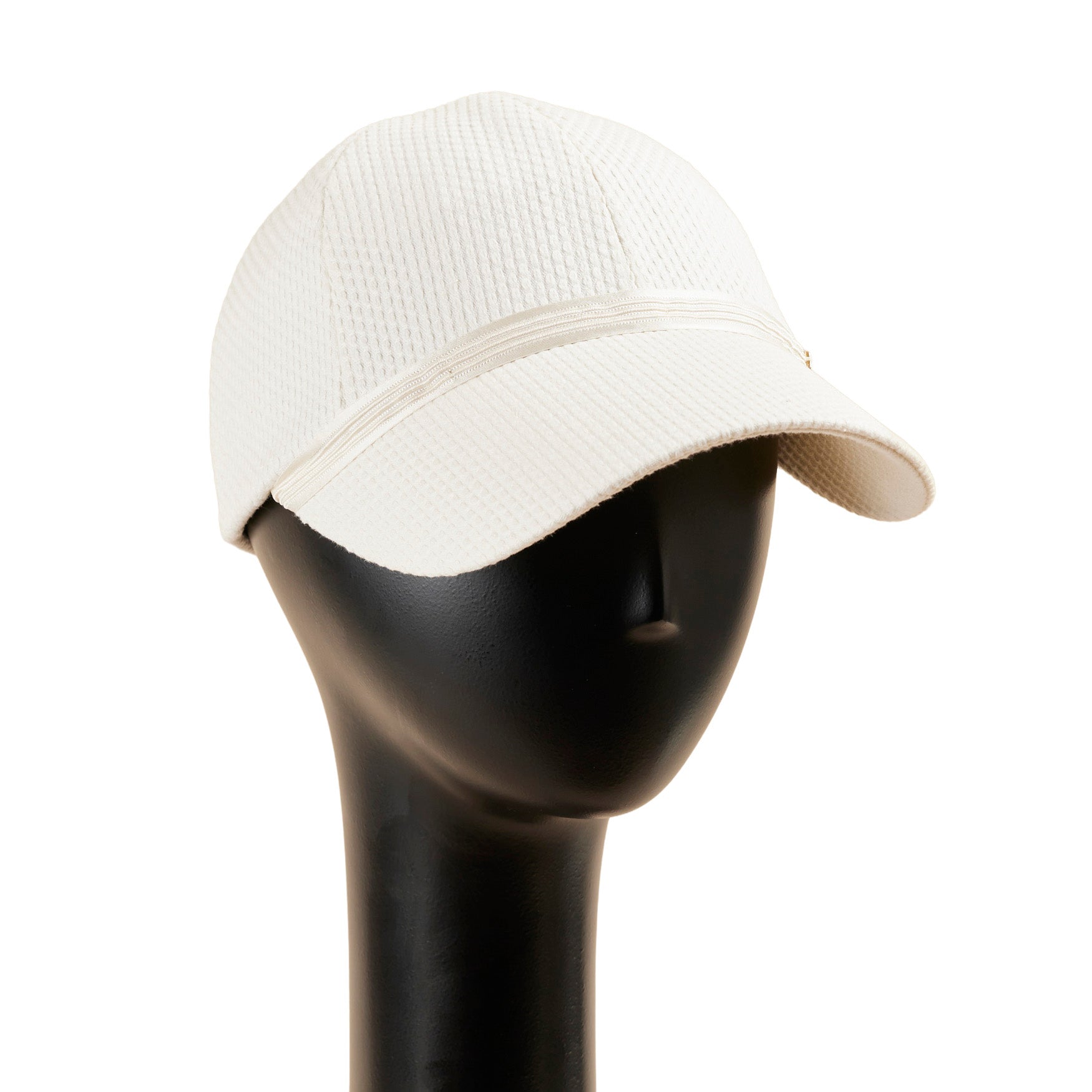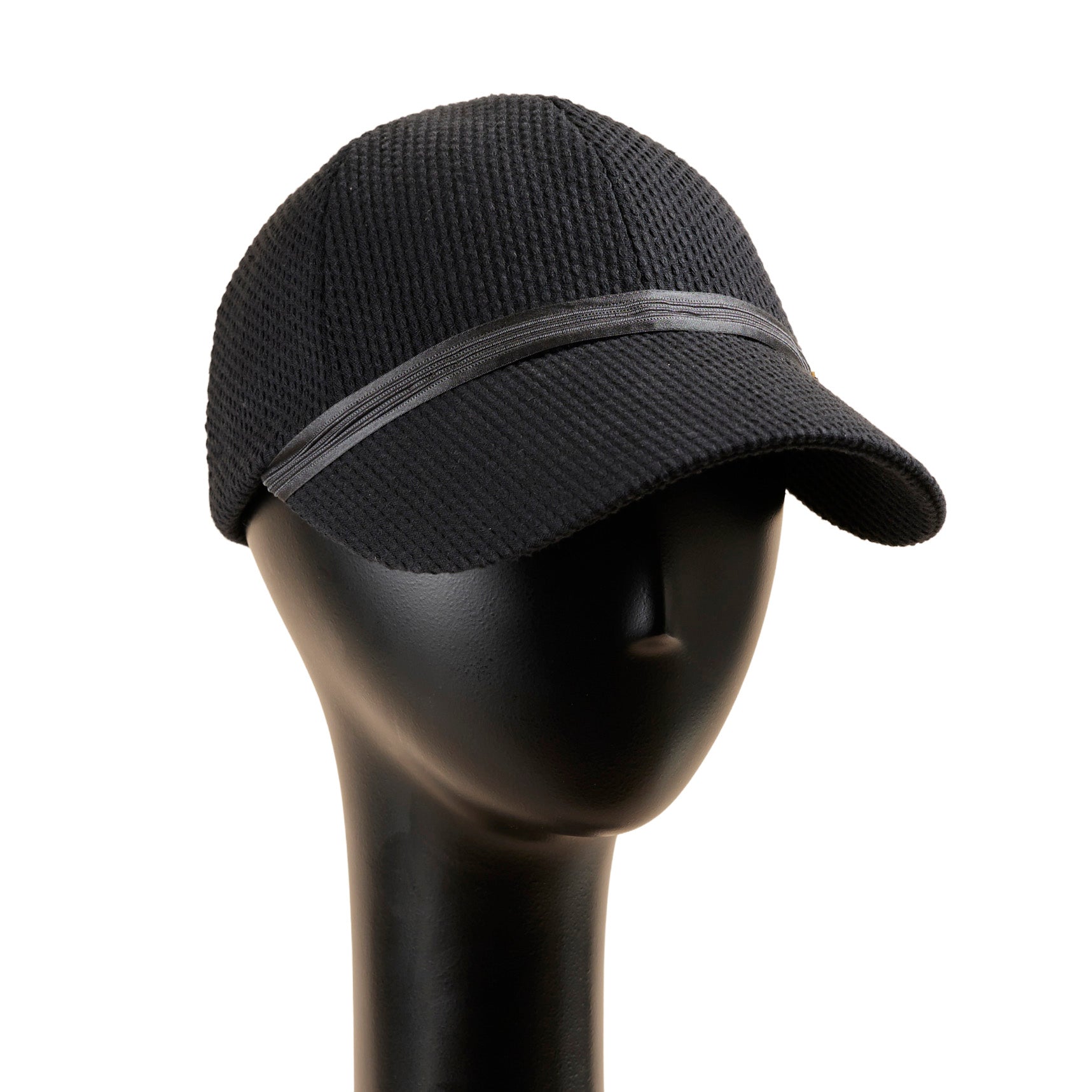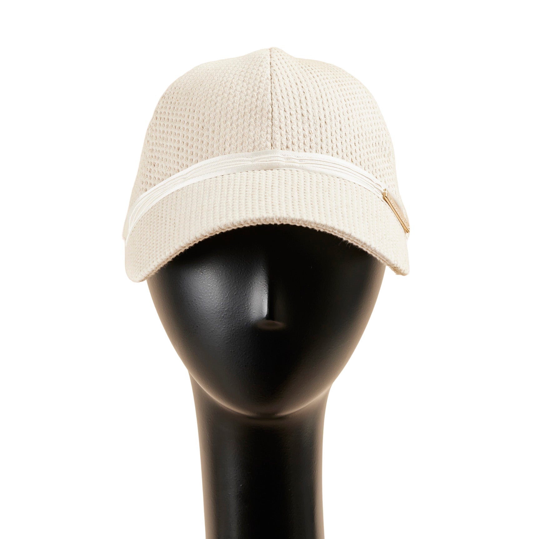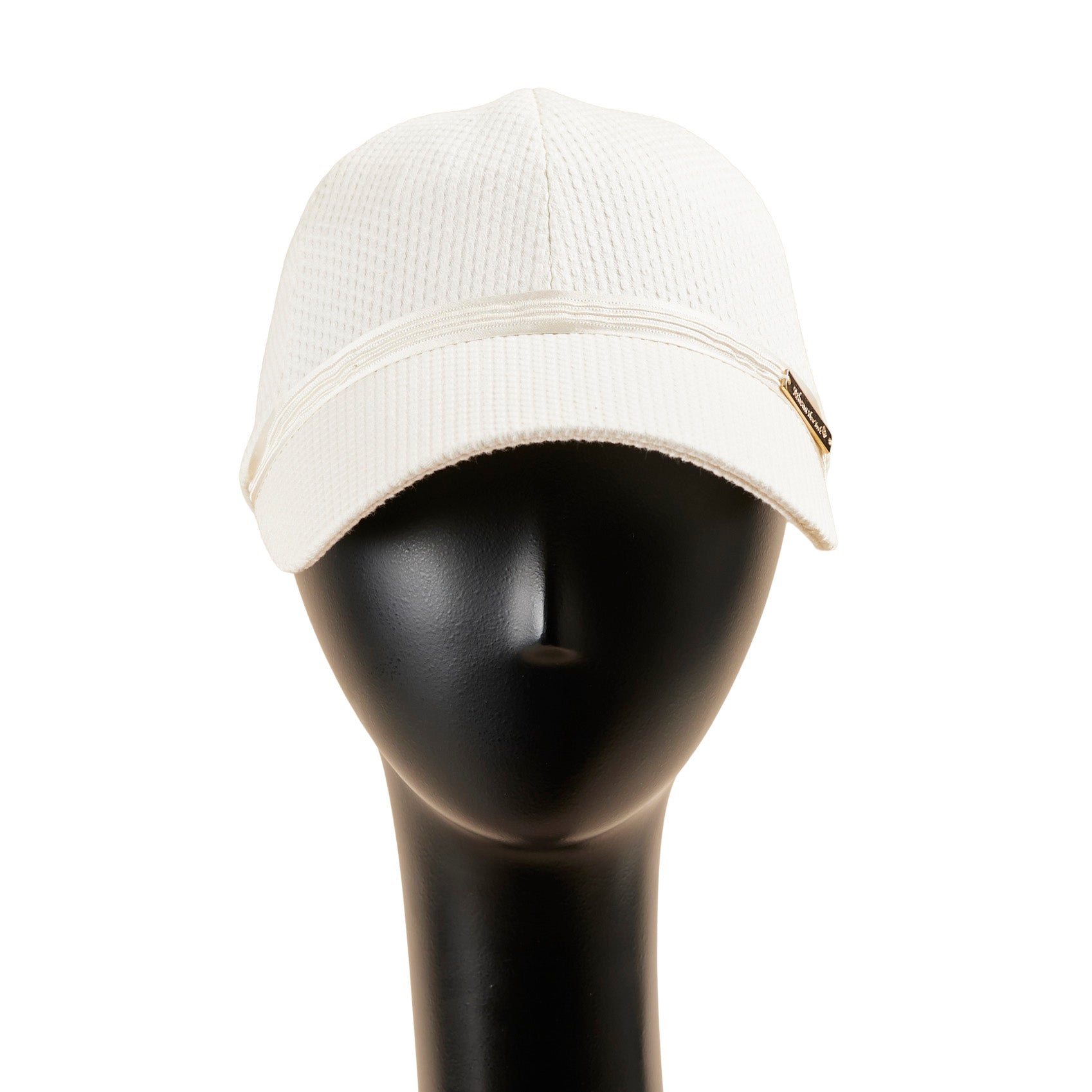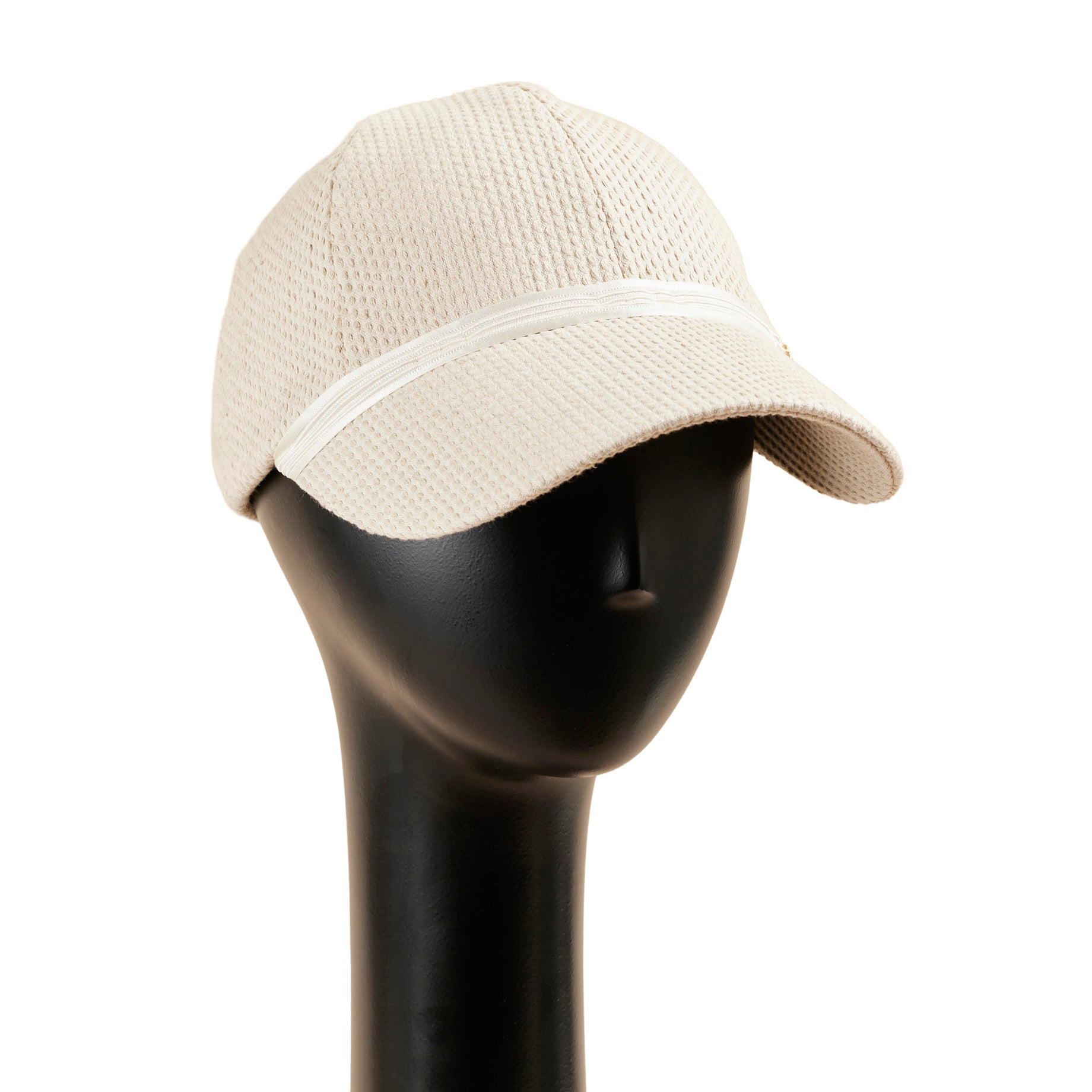 刺し子風の布帛(ふはく)を使って帽子本体を製作し、ブリムとクラウンの間に細く光沢のあるシルクリボンをあしらった、とてもシンプルなキャップ、Iman:イマン。リボンには膨らみのあるラインが3本はいっており、シンプルでありながら凝ったデザインになっています。左サイドにのせたゴールドカラーのブランドチャームが大人なキャップを演出しています。