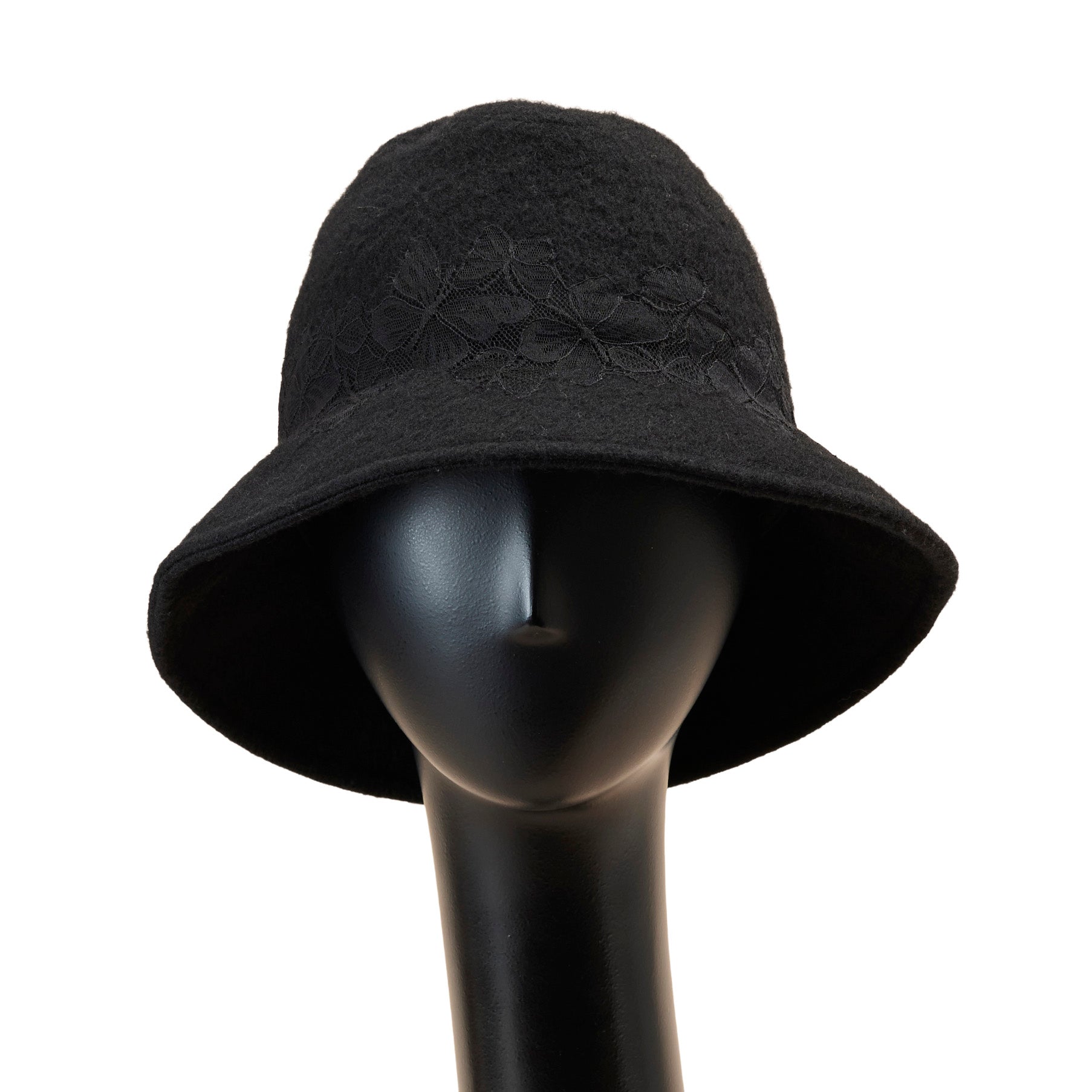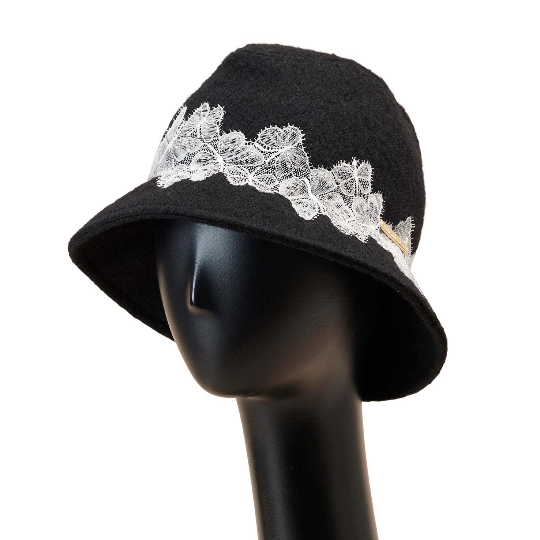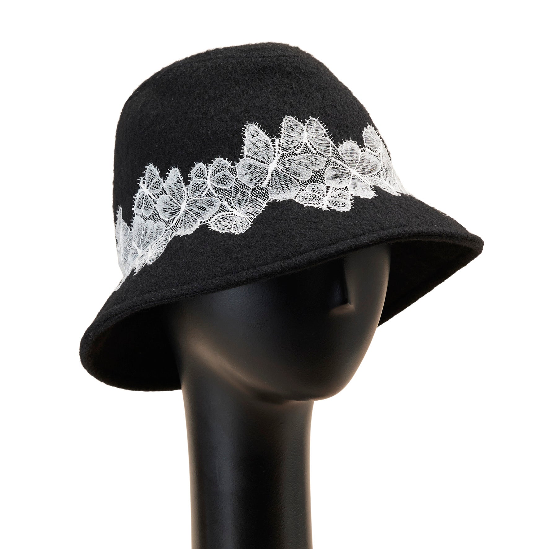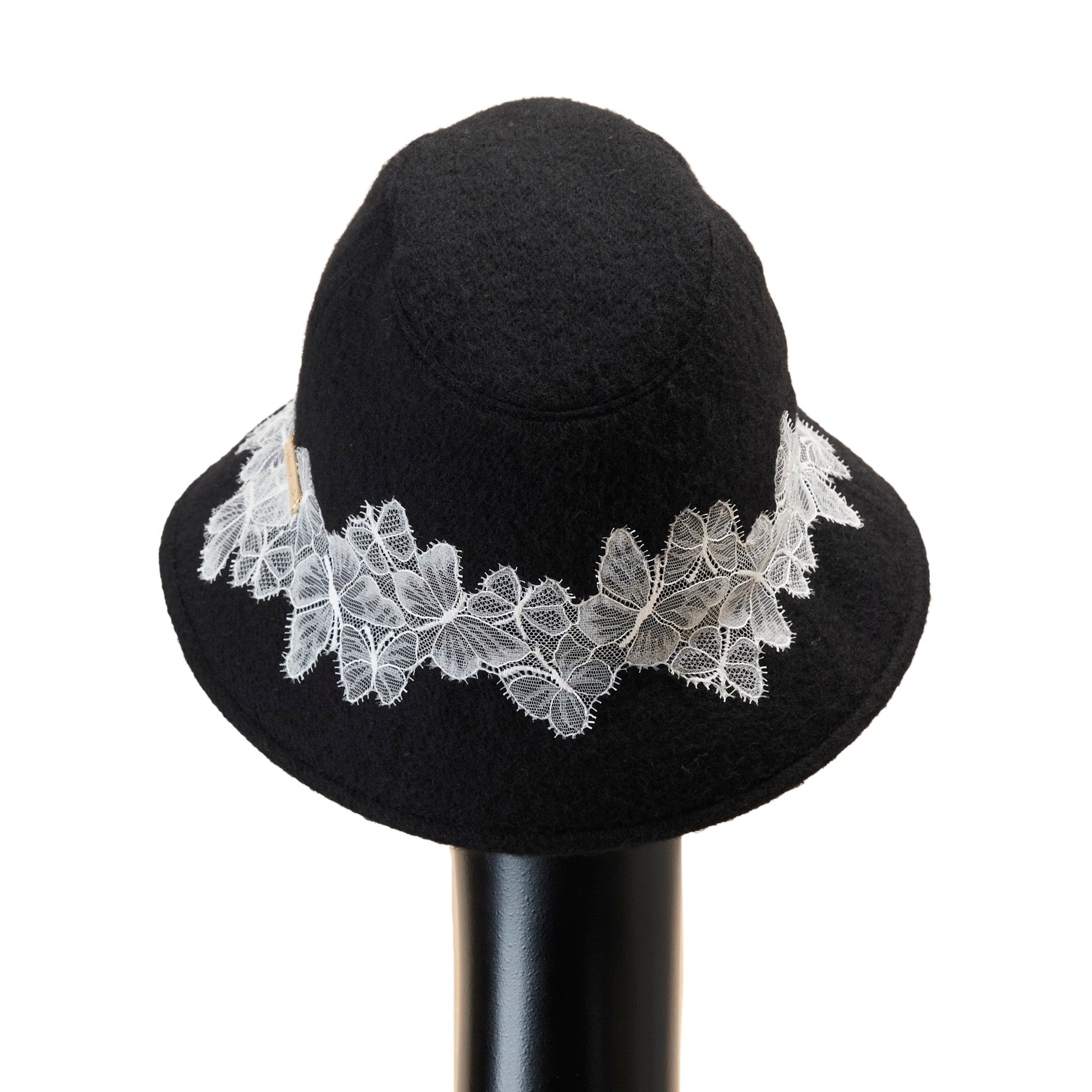 ブリムの短いクロシェ型のメンズライクな帽子本体に、蝶々をモチーフにした透け感のあるリボン状のレースを頭回りにアタッチ。マニッシュな帽子に華やかさをプラスした大人な帽子です。