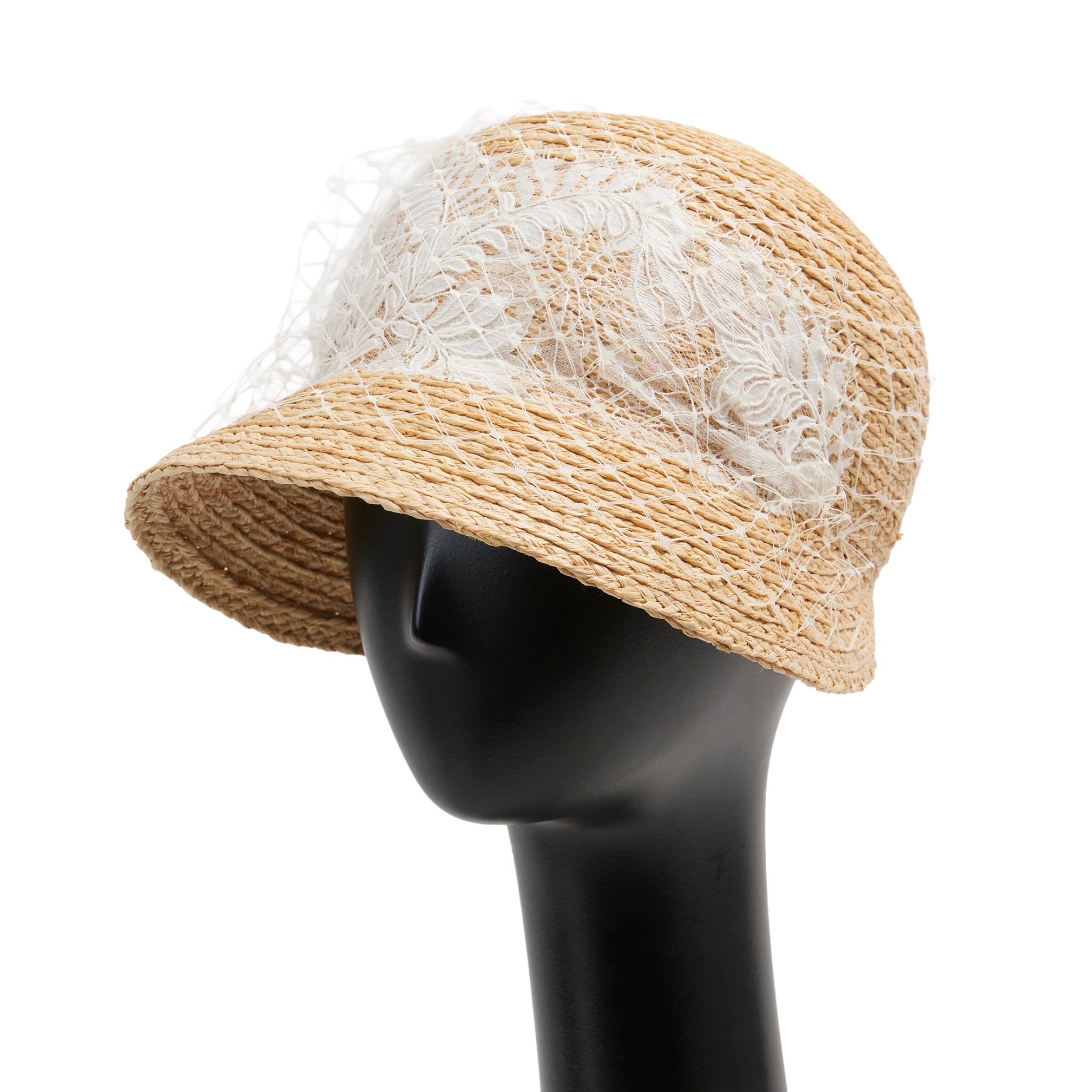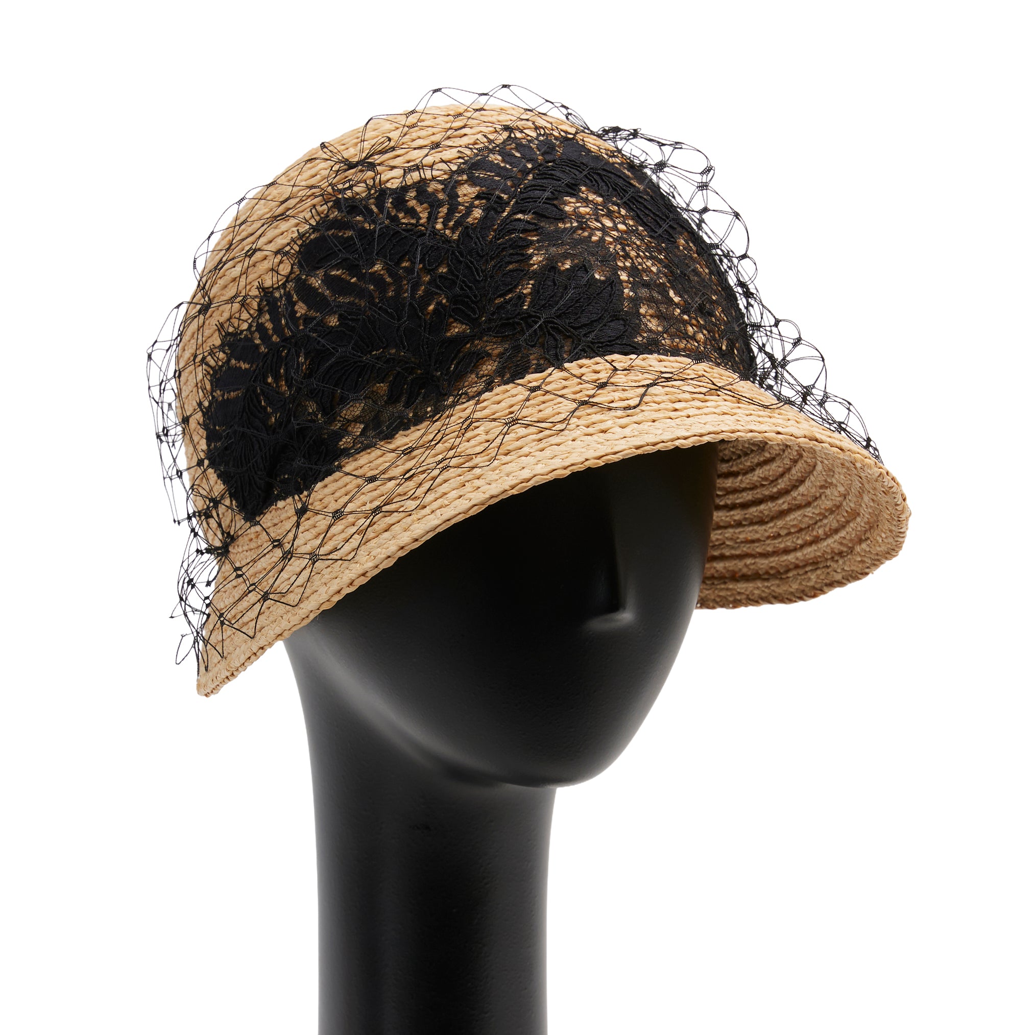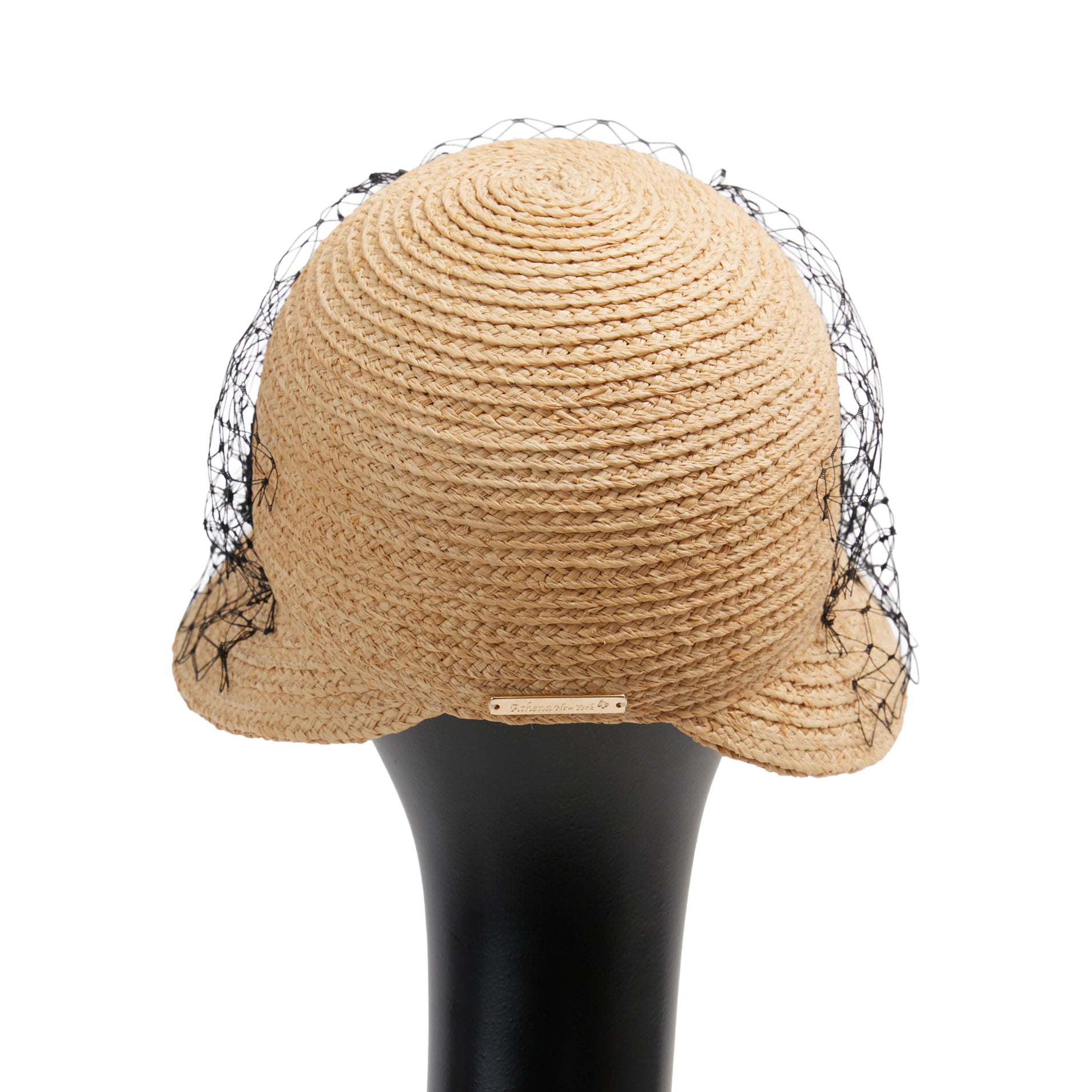 昨年のNewデザインの中で一番人気のあったボンネット型の帽子が、今年もデザインを変えてラインナップ。耳が隠れるほどサイドのブリム(つば)が広く、深くかぶっても視界を邪魔しません。装飾は唐草模様のレースを前頭部にあしらい、その上からチュールをかぶせた大人フェミニンで、ひときわ存在感のあるデザインです。