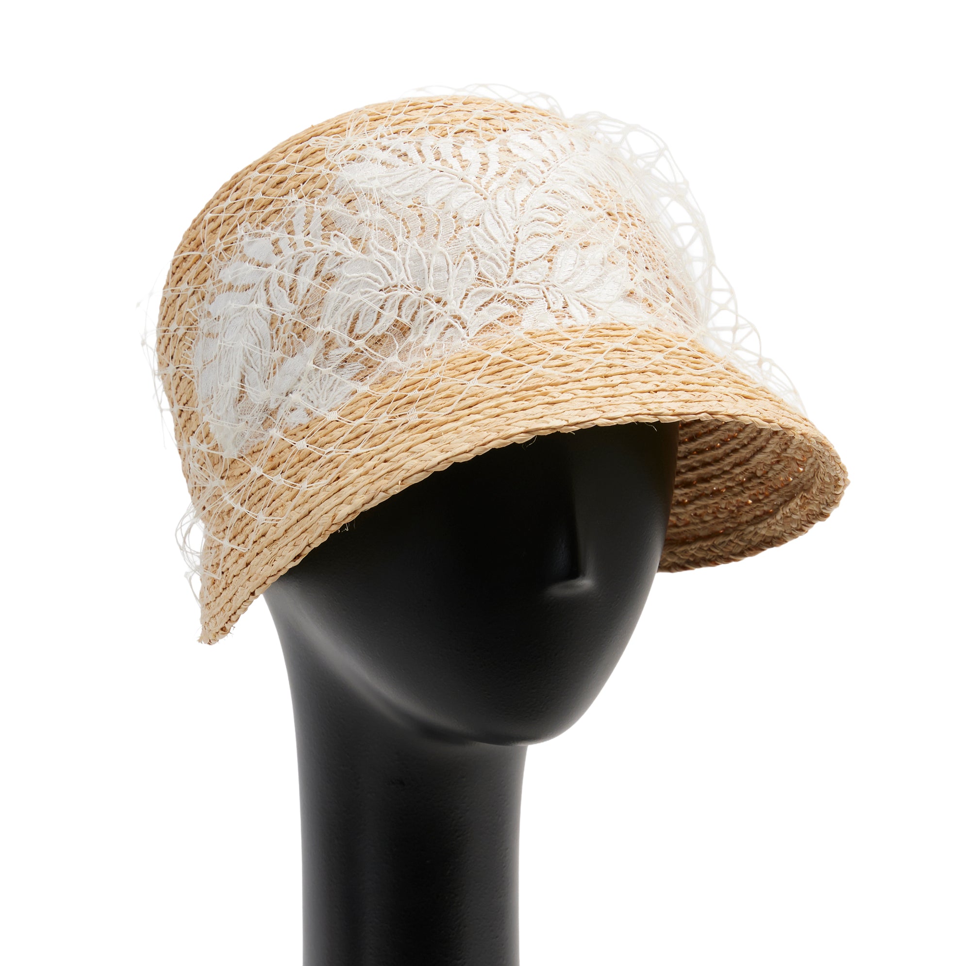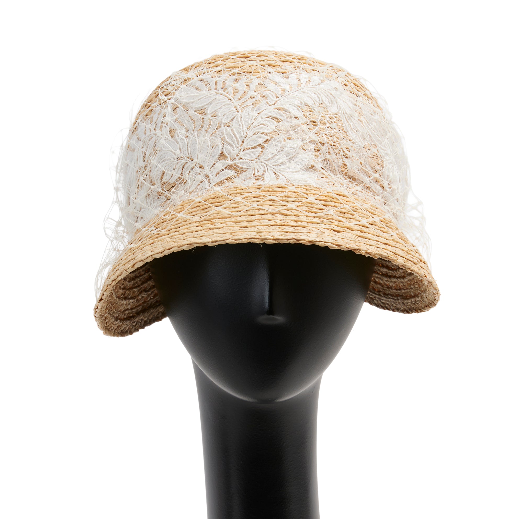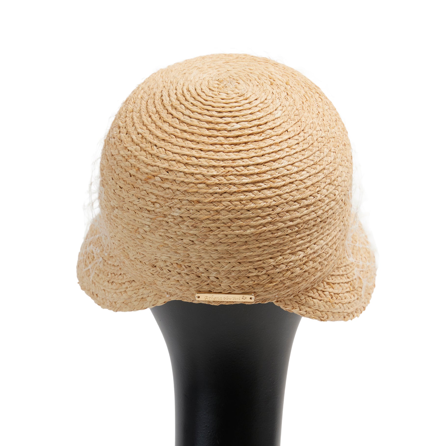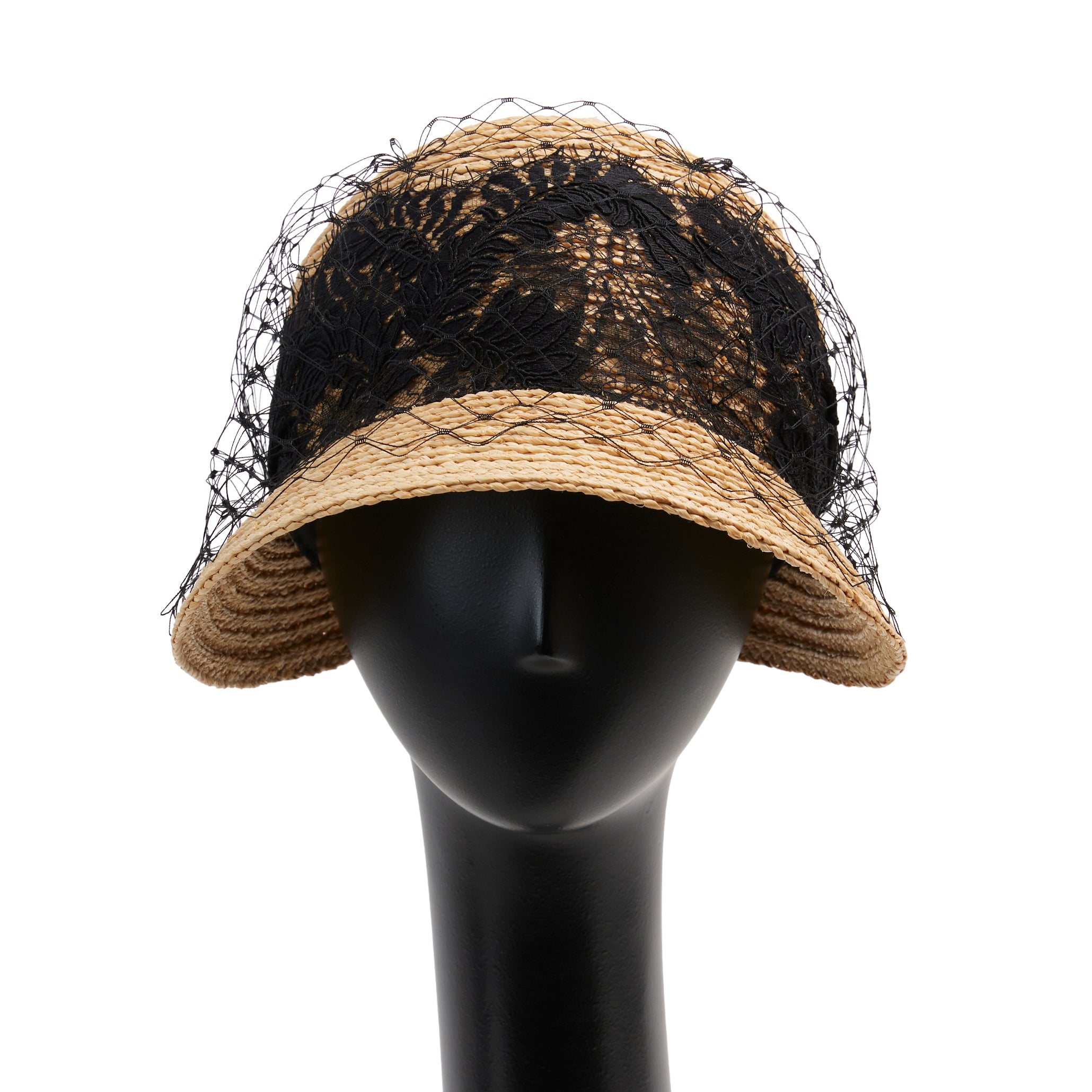 昨年のNewデザインの中で一番人気のあったボンネット型の帽子が、今年もデザインを変えてラインナップ。耳が隠れるほどサイドのブリム(つば)が広く、深くかぶっても視界を邪魔しません。装飾は唐草模様のレースを前頭部にあしらい、その上からチュールをかぶせた大人フェミニンで、ひときわ存在感のあるデザインです。