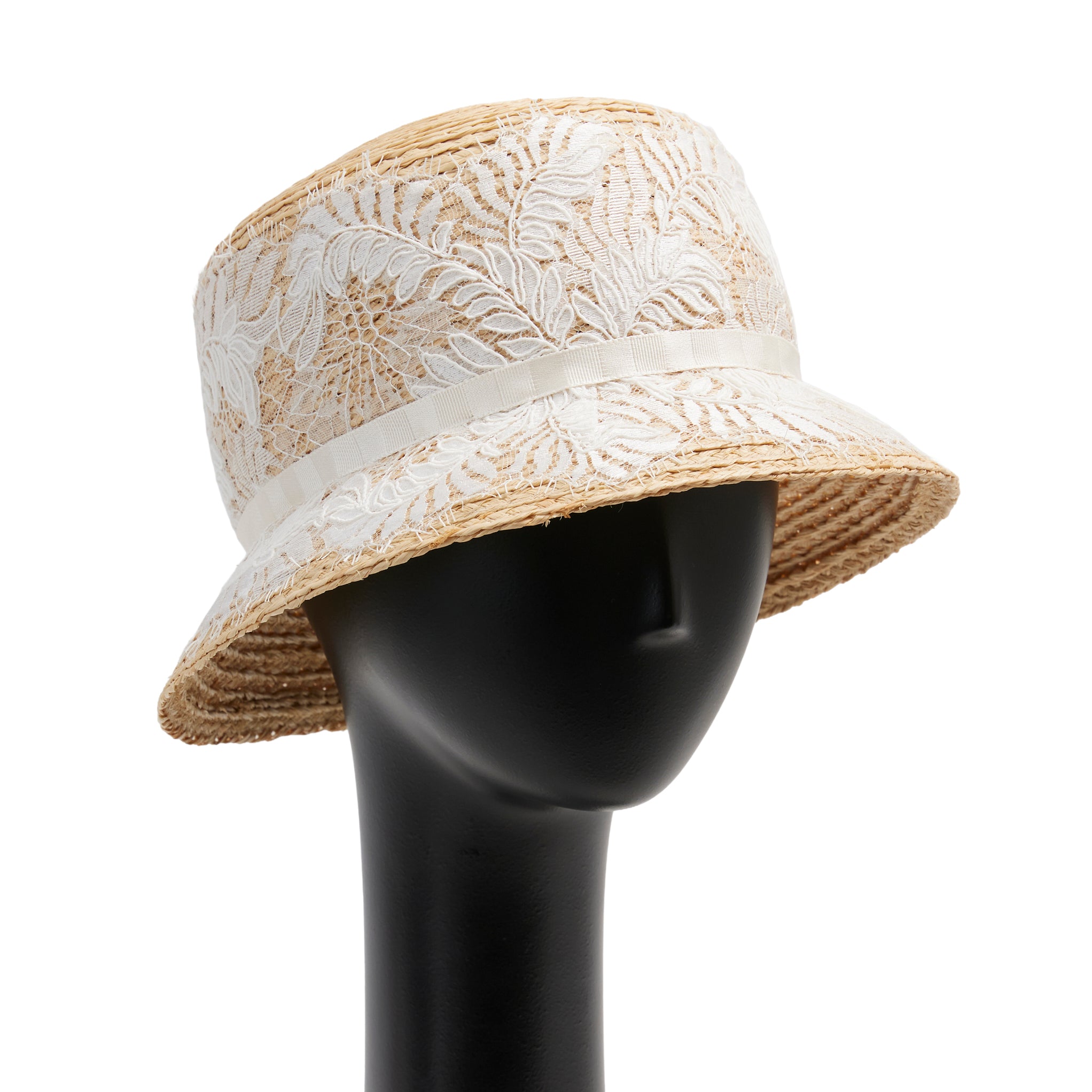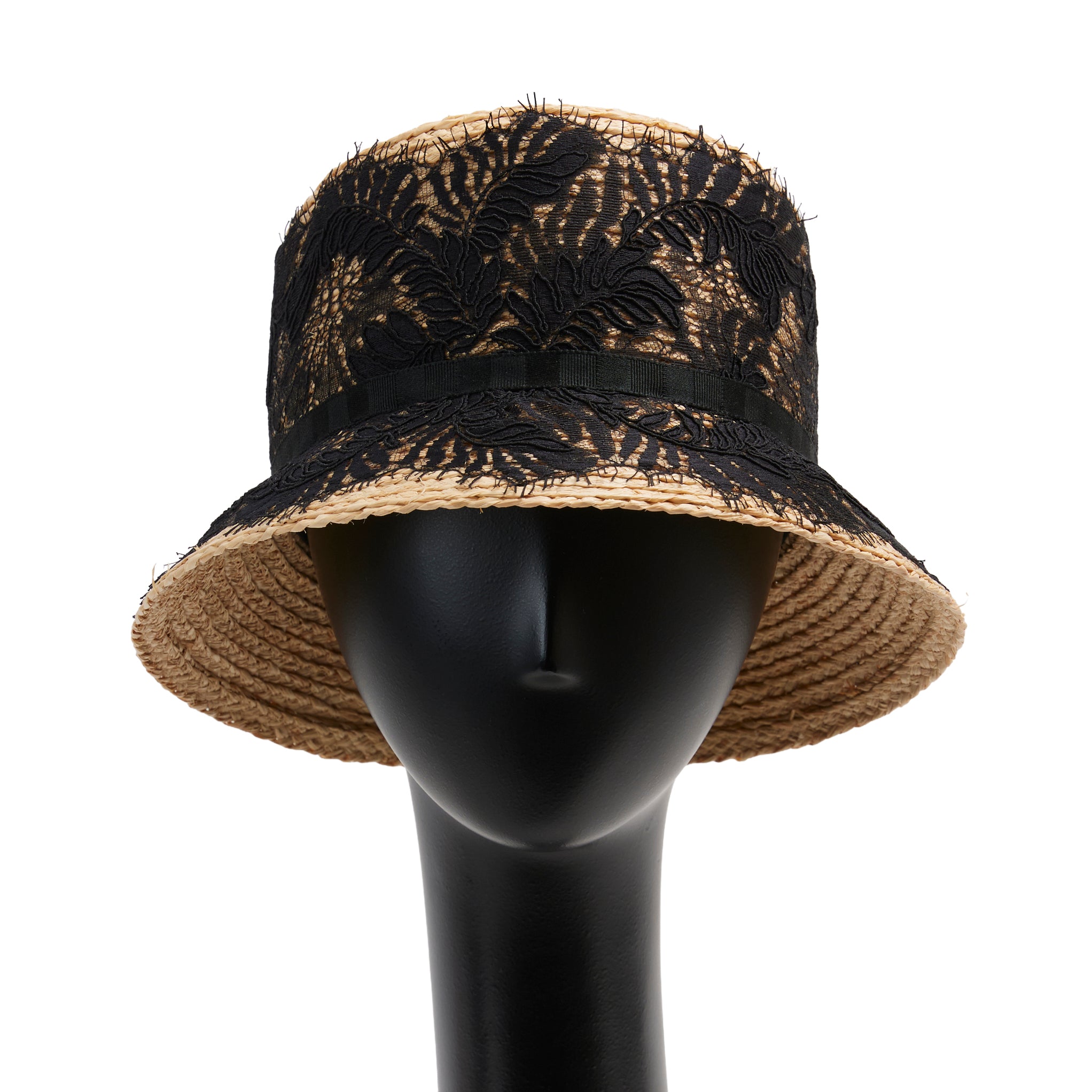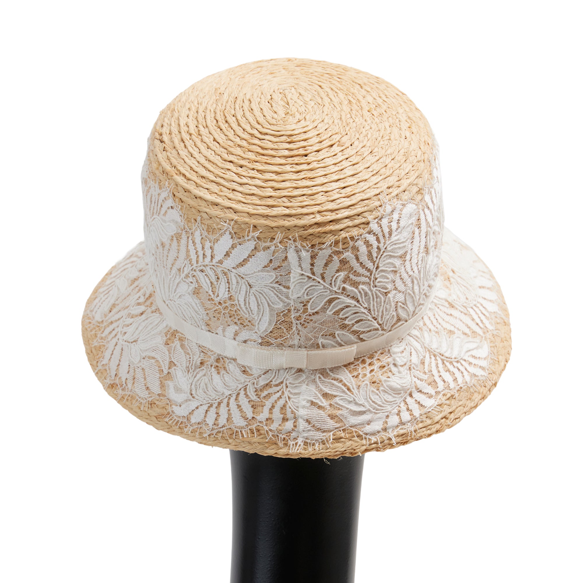天然草木(ラフィア)で作られたバケット型の帽子本体に、唐草模様の幅広レースを全体にあしらい、その上から頭回りにシルクリボンを施した、とても華美な帽子。透けたレースの部分からうつる、帽子本体のラフィアが涼やかさを演出しています。