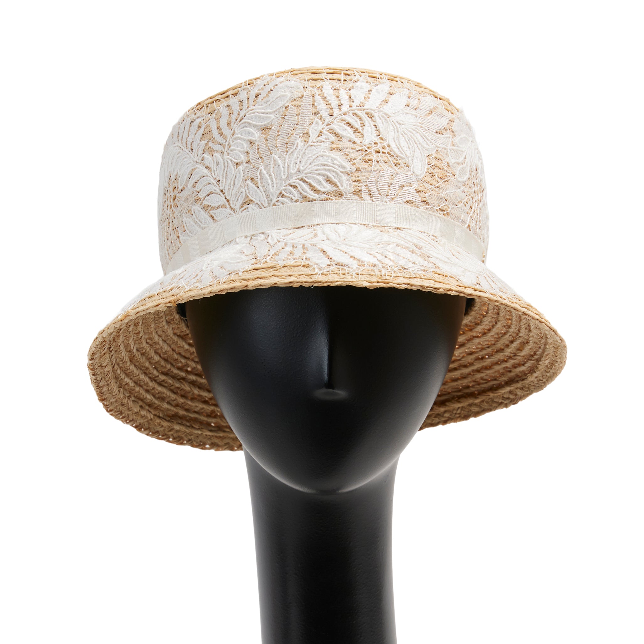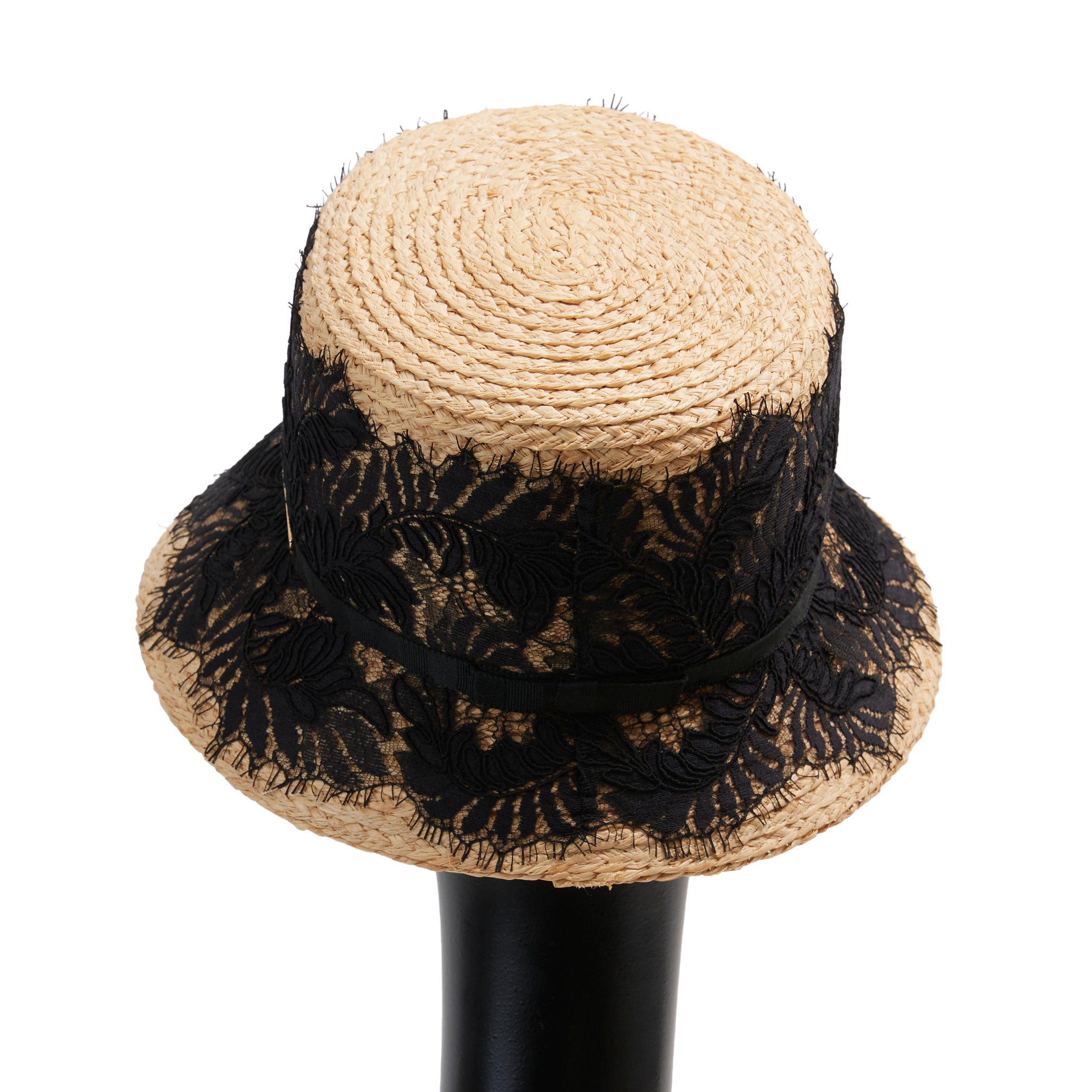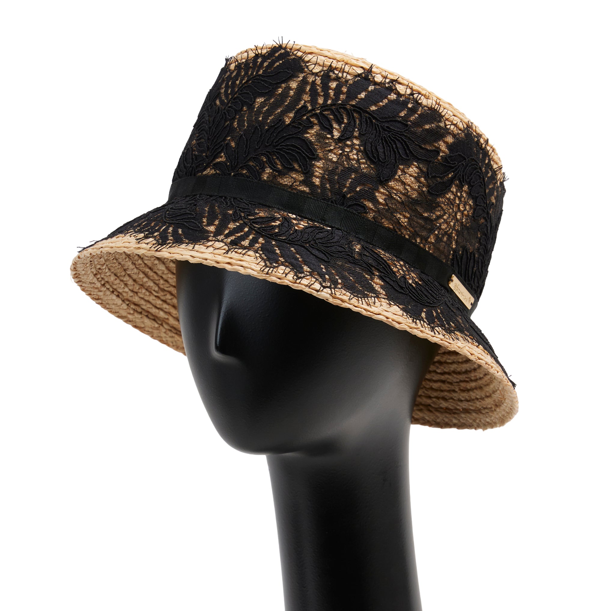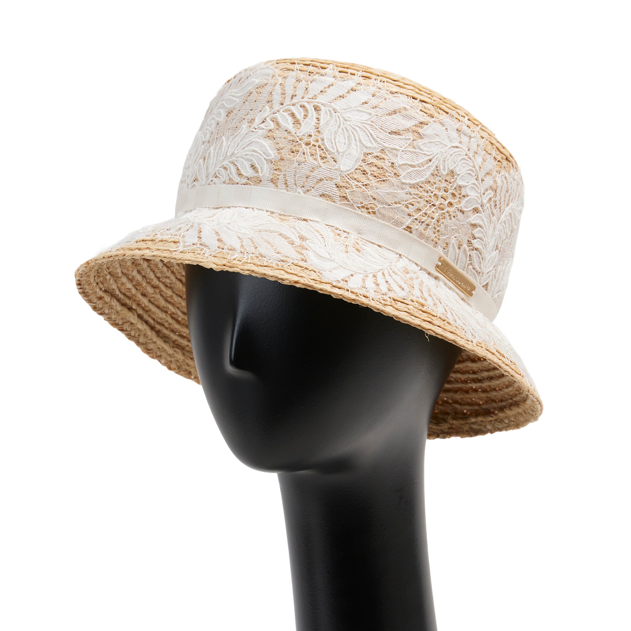 天然草木(ラフィア)で作られたバケット型の帽子本体に、唐草模様の幅広レースを全体にあしらい、その上から頭回りにシルクリボンを施した、とても華美な帽子。透けたレースの部分からうつる、帽子本体のラフィアが涼やかさを演出しています。