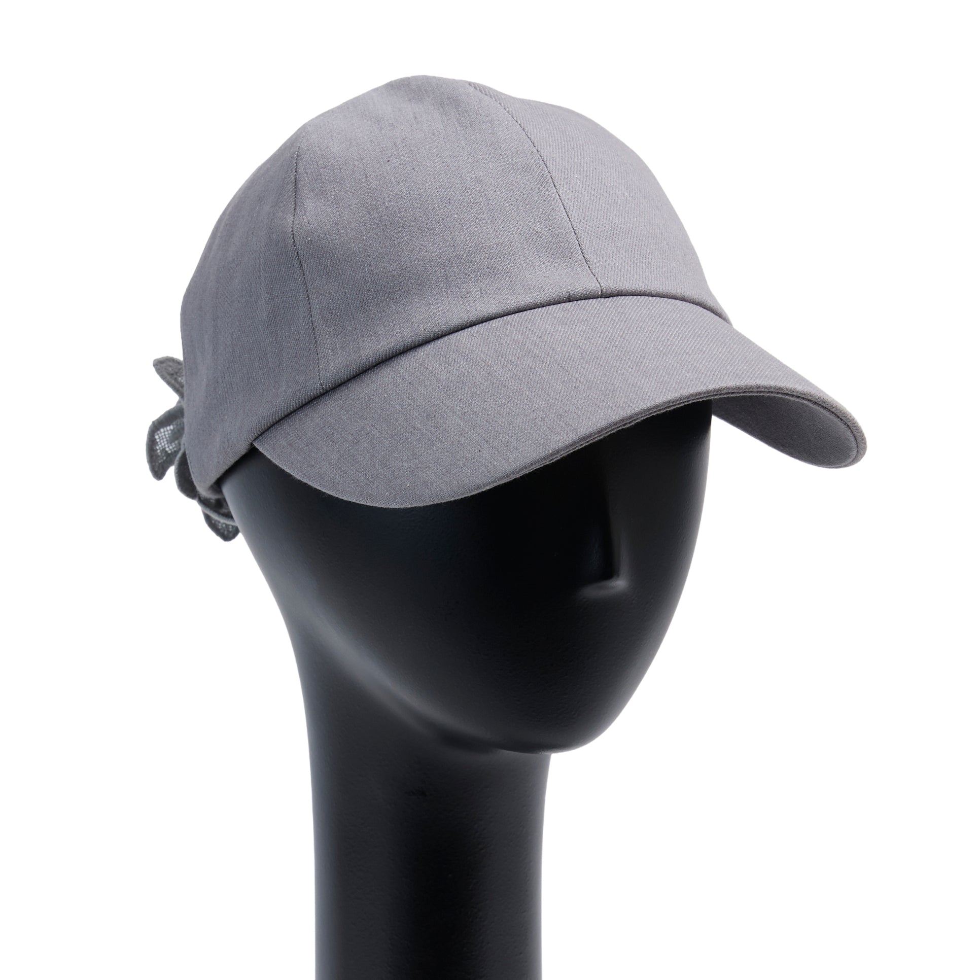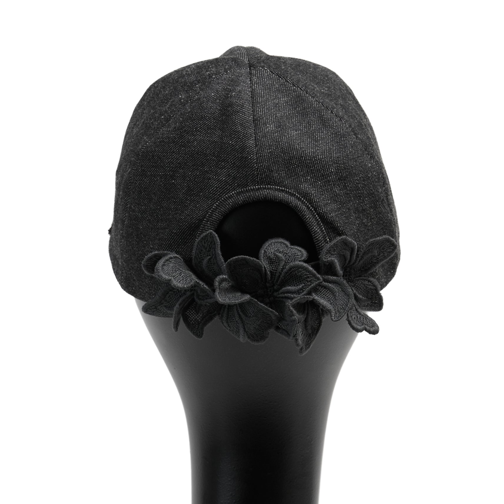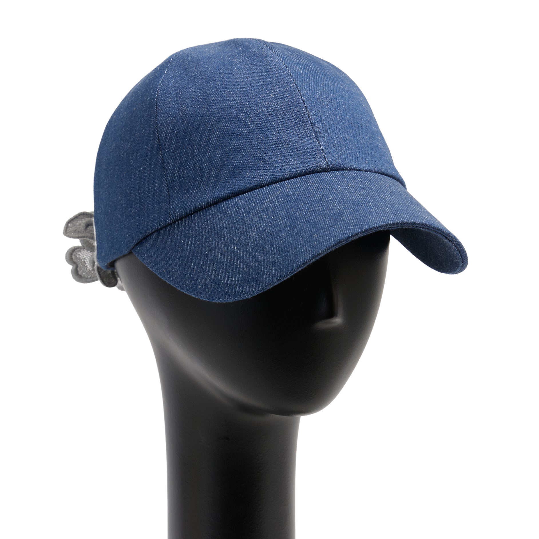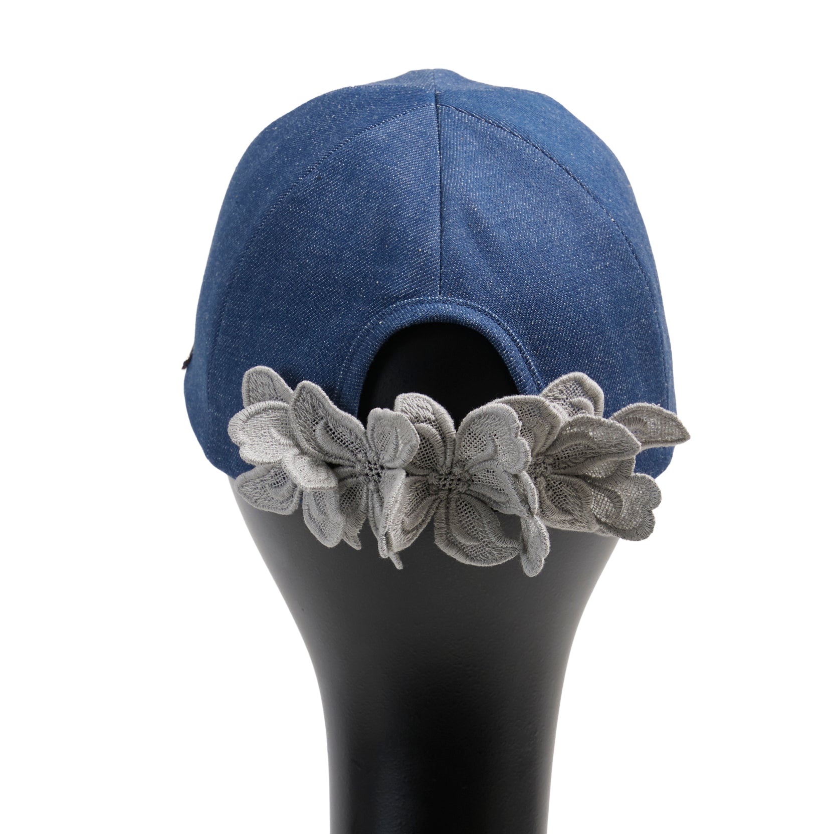 今季Newデザインのキャップ、Alicia : アリシア。岡山県産のデニム生地を使って製作した帽子本体に、春夏帽子で長年人気の『Amanda:アマンダ』に使われているフラワーモチーフのレースを、何枚も連ねてコサージュのように立体的に装飾。洗練されたデザインの大人キャップに仕上がっています。髪を後ろでまとめた際、ラウンドカットした部分から髪を出すことができます。今季のNewカラーは2色です。