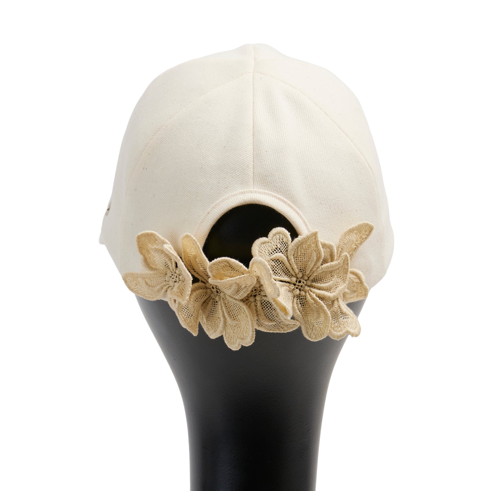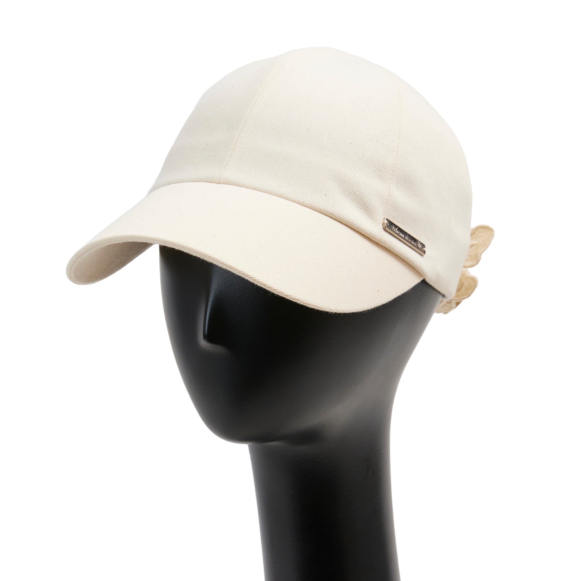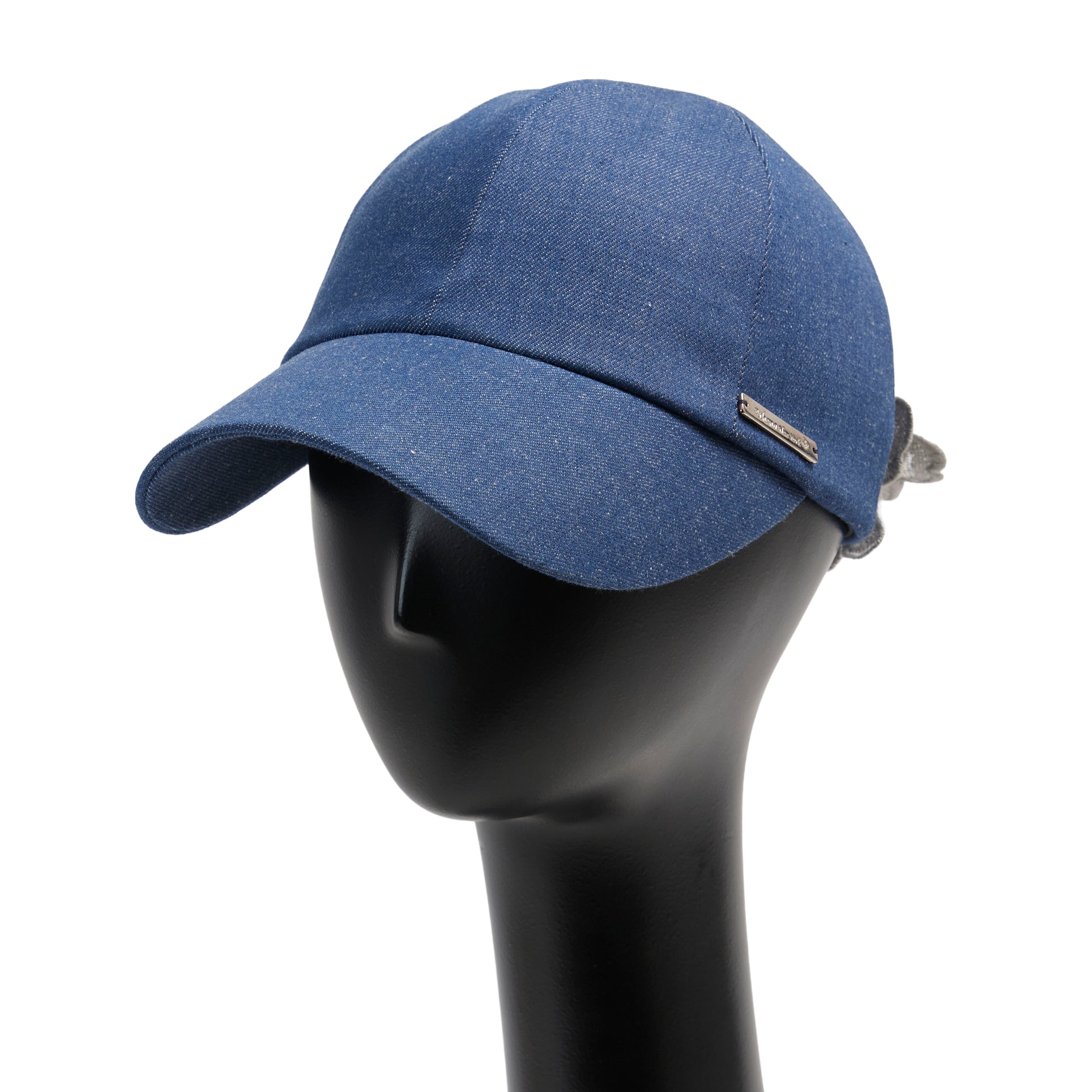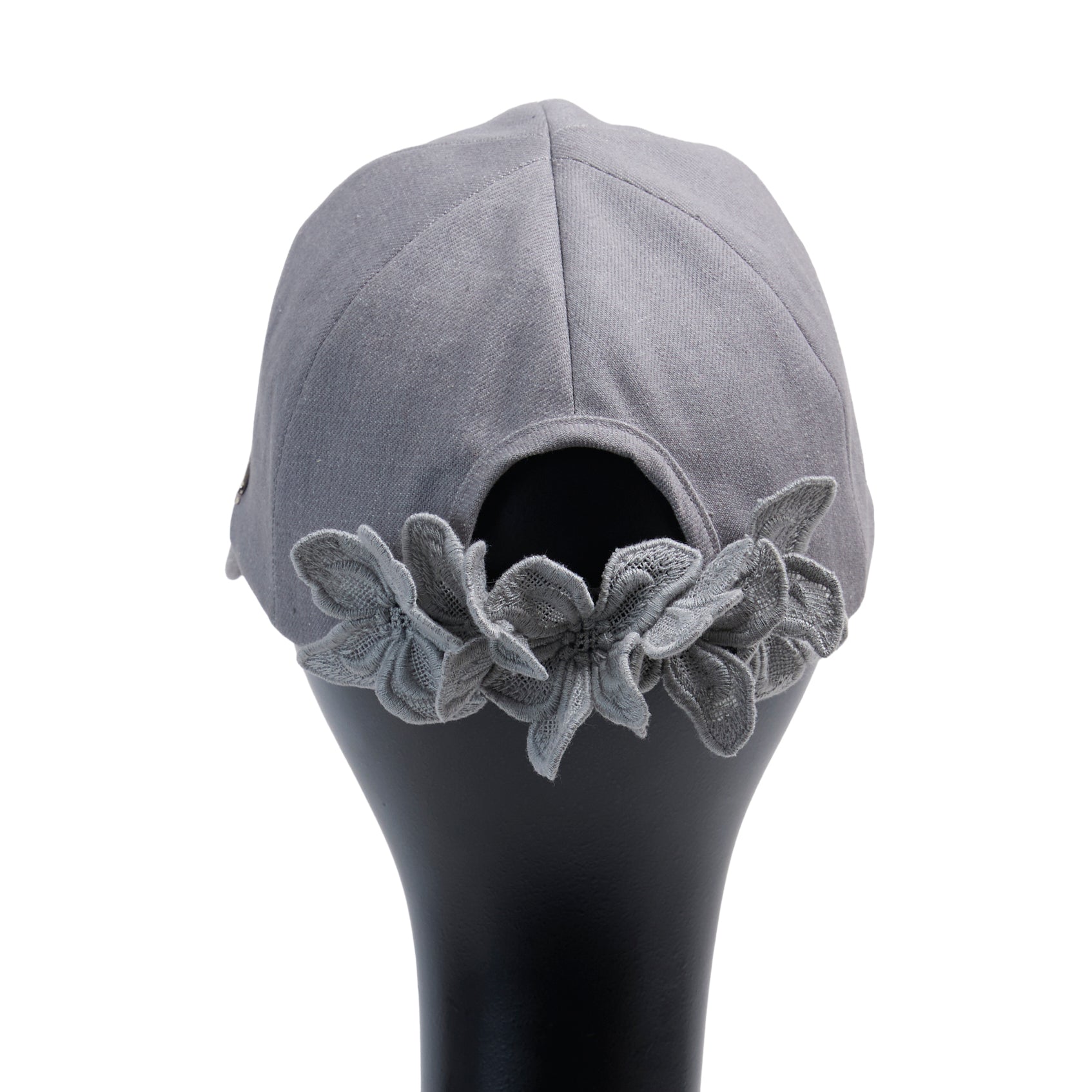 今季Newデザインのキャップ、Alicia : アリシア。岡山県産のデニム生地を使って製作した帽子本体に、春夏帽子で長年人気の『Amanda:アマンダ』に使われているフラワーモチーフのレースを、何枚も連ねてコサージュのように立体的に装飾。洗練されたデザインの大人キャップに仕上がっています。髪を後ろでまとめた際、ラウンドカットした部分から髪を出すことができます。今季のNewカラーは2色です。