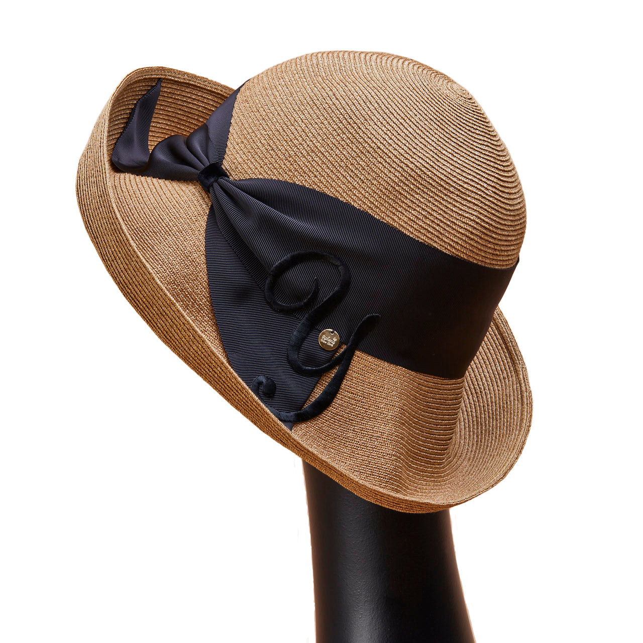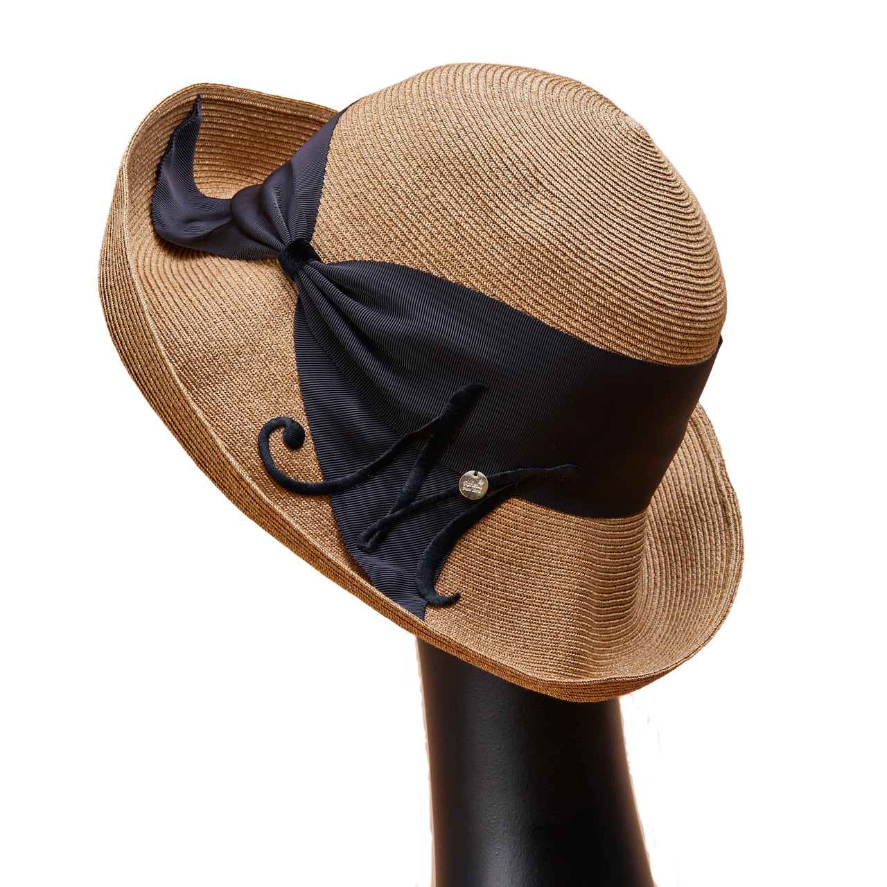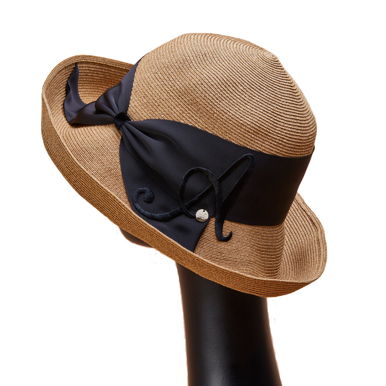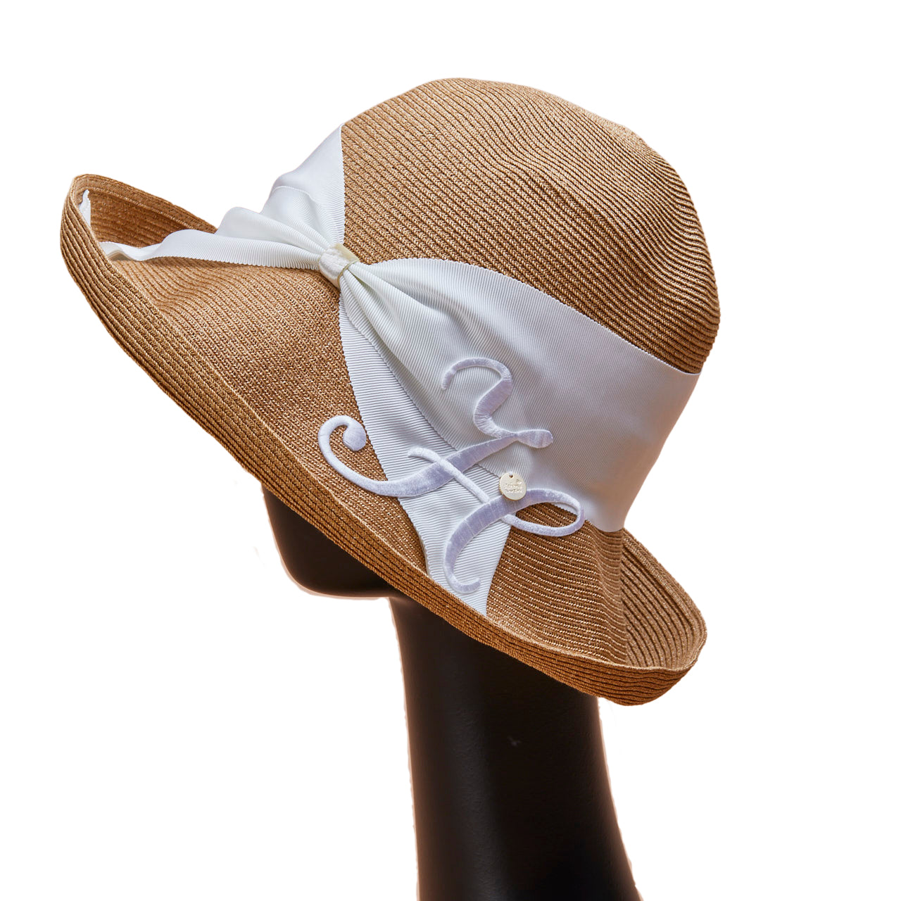 Athena New York "Official Online Shop" 限定のイニシャル付きRisako/リサコ。リサコ(帽子の名前)の白色リボンと黒色リボンに、好きなイニシャルを1文字装飾できます。イニシャルにはA・E・H・K・M・N・R・S・T・Yの10文字から選べます。リボンと同色の大きなイニシャルは、光沢があり気品を感じられるフォントデザイン。自分用としても、大切な方へのプレゼントとしても、喜ばれる事まちがいないスペシャル帽子。