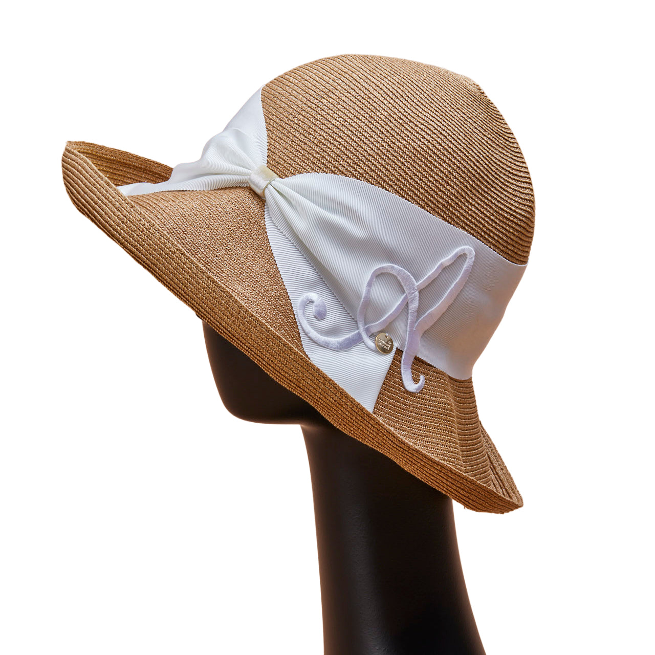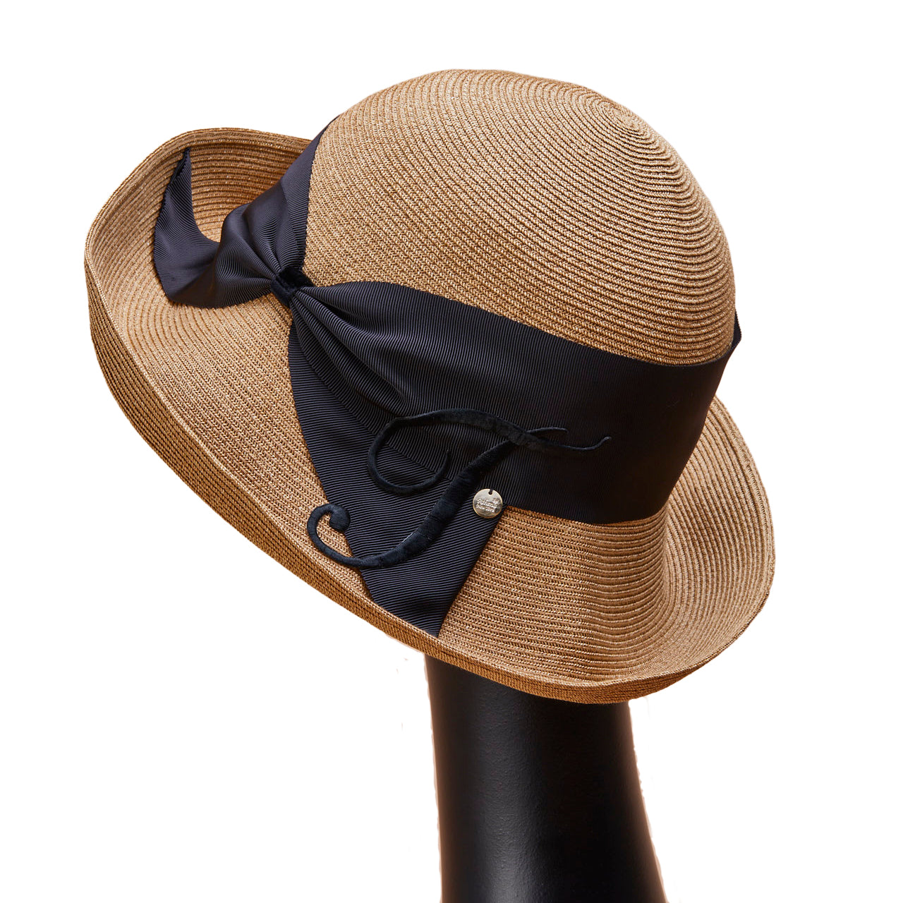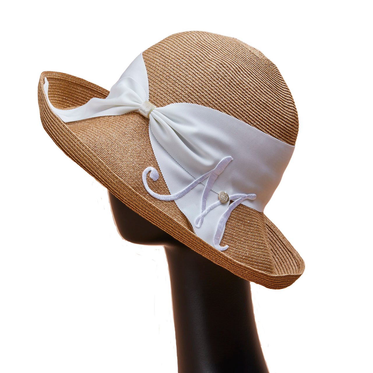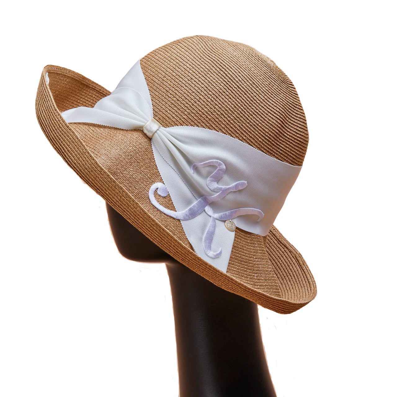 Athena New York "Official Online Shop" 限定のイニシャル付きRisako/リサコ。リサコ(帽子の名前)の白色リボンと黒色リボンに、好きなイニシャルを1文字装飾できます。イニシャルにはA・E・H・K・M・N・R・S・T・Yの10文字から選べます。リボンと同色の大きなイニシャルは、光沢があり気品を感じられるフォントデザイン。自分用としても、大切な方へのプレゼントとしても、喜ばれる事まちがいないスペシャル帽子。