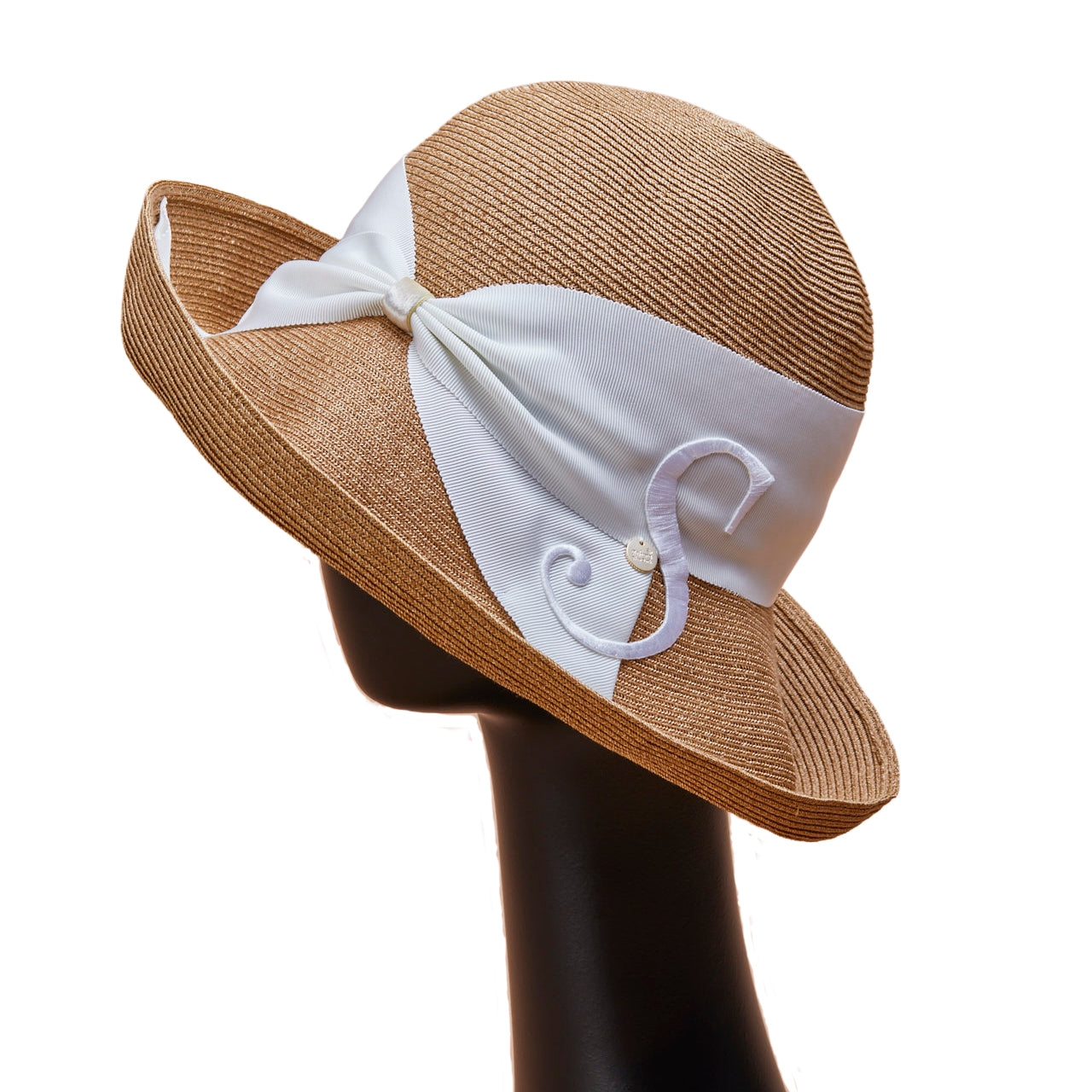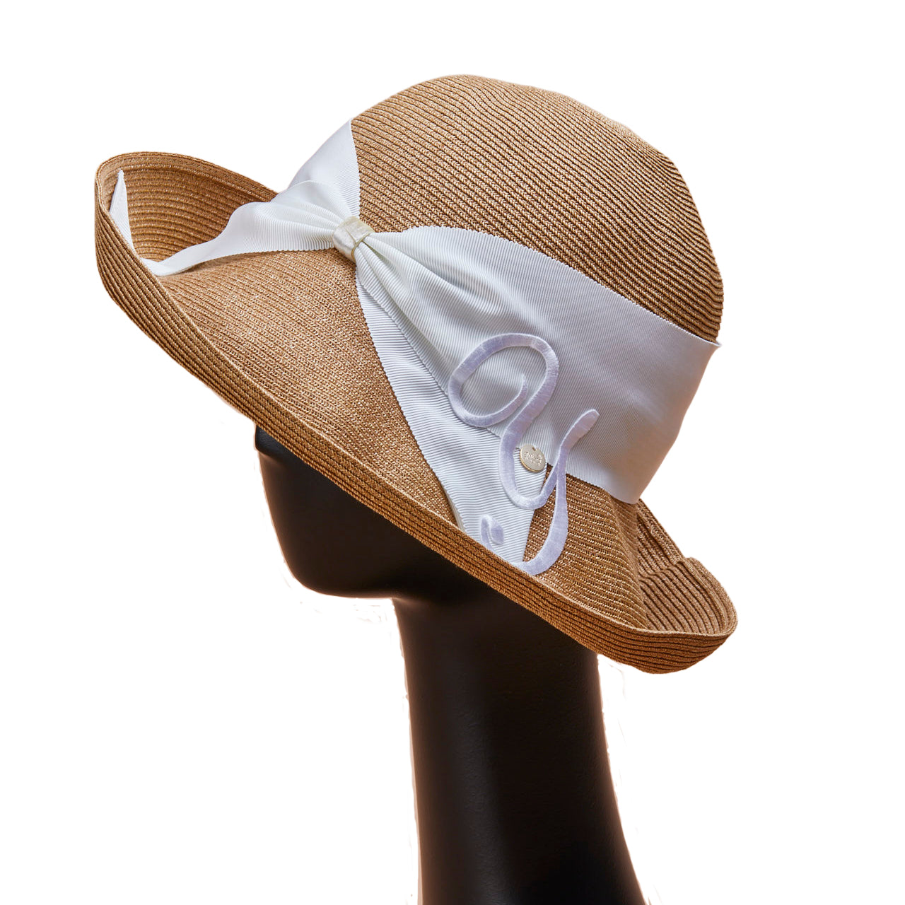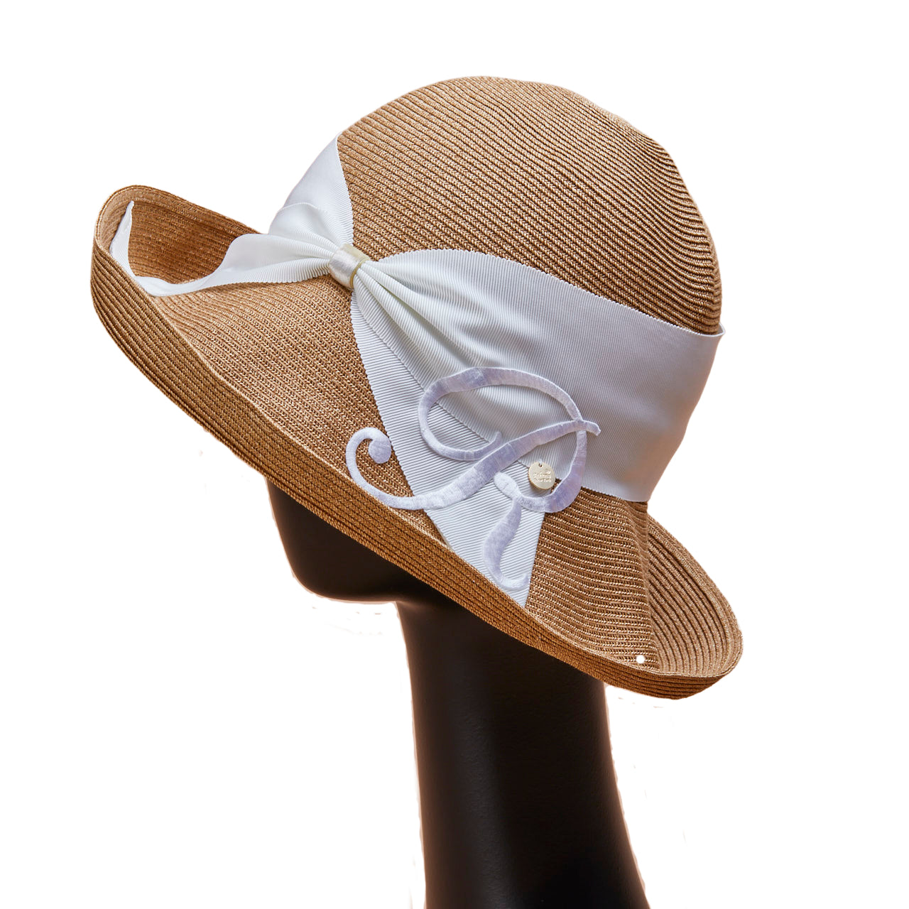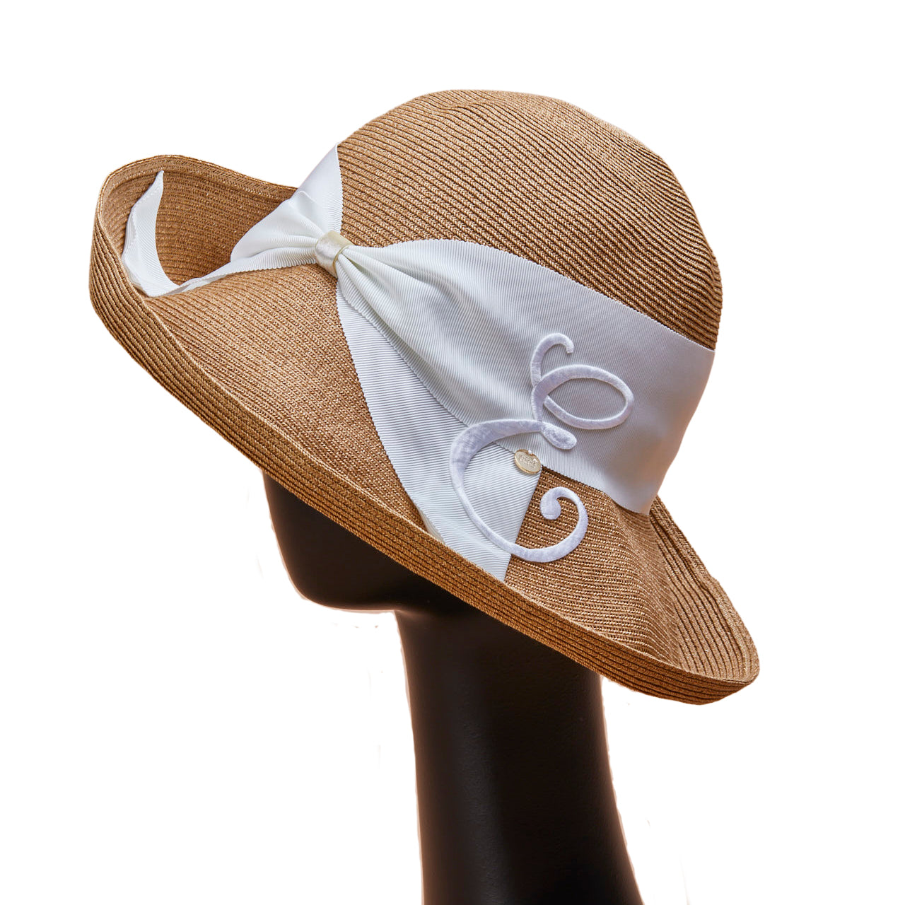 Athena New York "Official Online Shop" 限定のイニシャル付きRisako/リサコ。リサコ(帽子の名前)の白色リボンと黒色リボンに、好きなイニシャルを1文字装飾できます。イニシャルにはA・E・H・K・M・N・R・S・T・Yの10文字から選べます。リボンと同色の大きなイニシャルは、光沢があり気品を感じられるフォントデザイン。自分用としても、大切な方へのプレゼントとしても、喜ばれる事まちがいないスペシャル帽子。